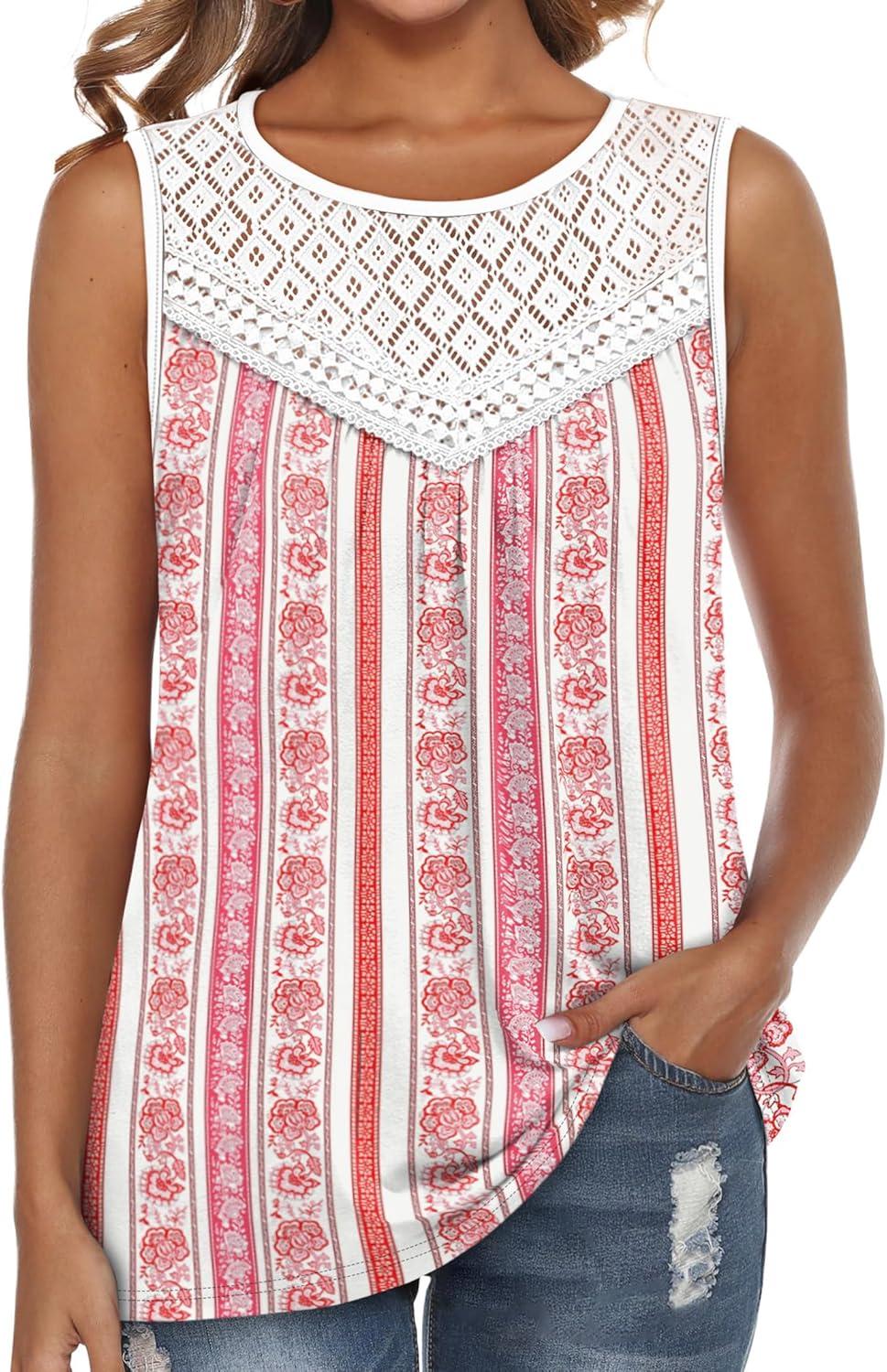 Boho Tops for Women Plus Size Clothes for Women Loose Fit Summer Tank Tops Pleated Sleeveless Vacation Outfits Lace Tops Pink Floral 3XL