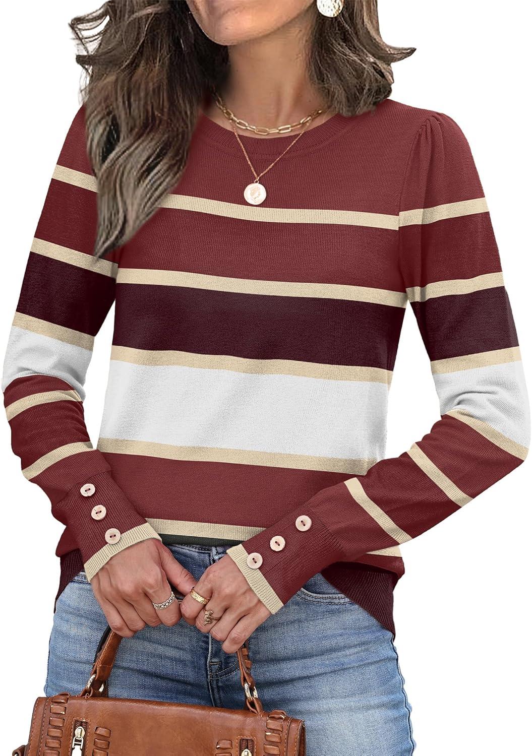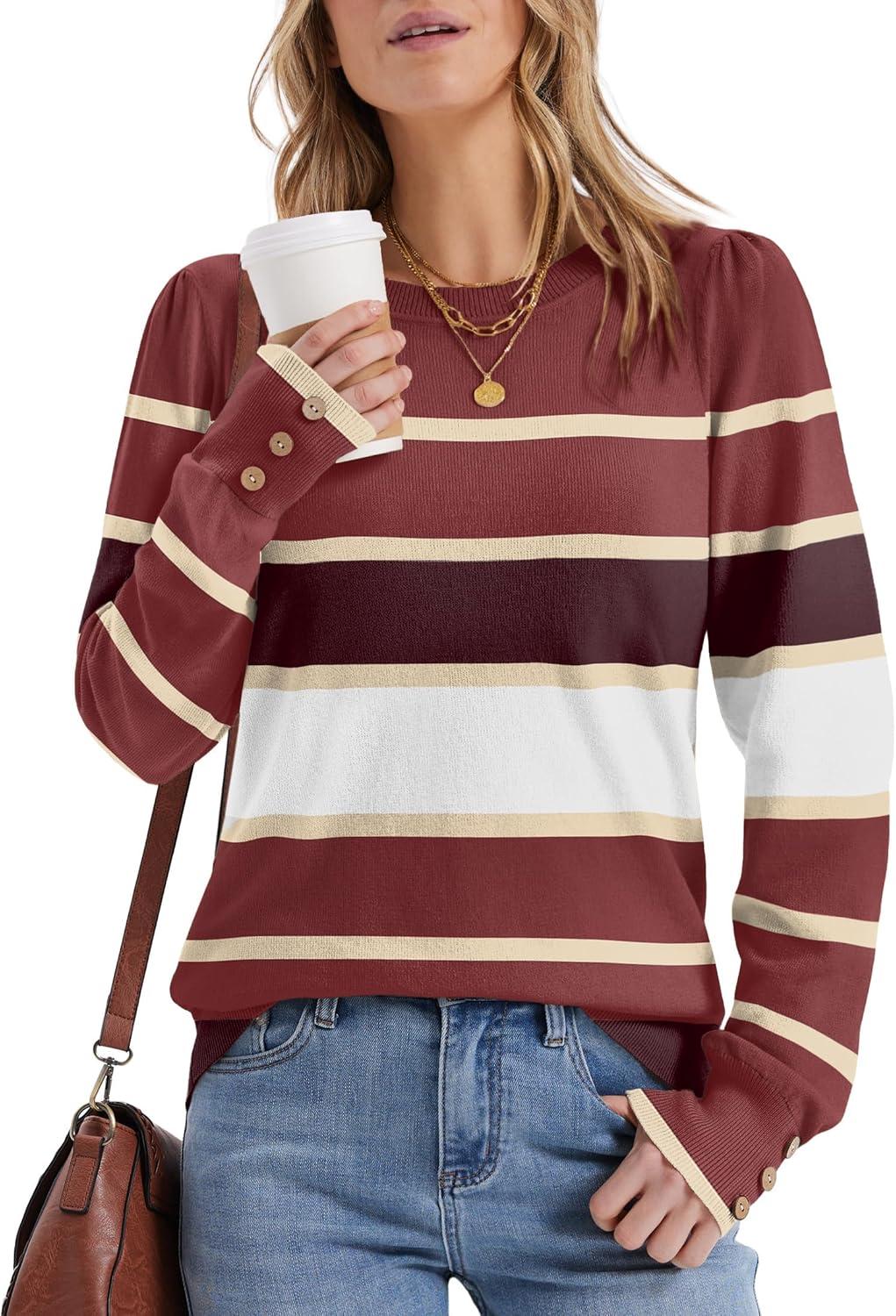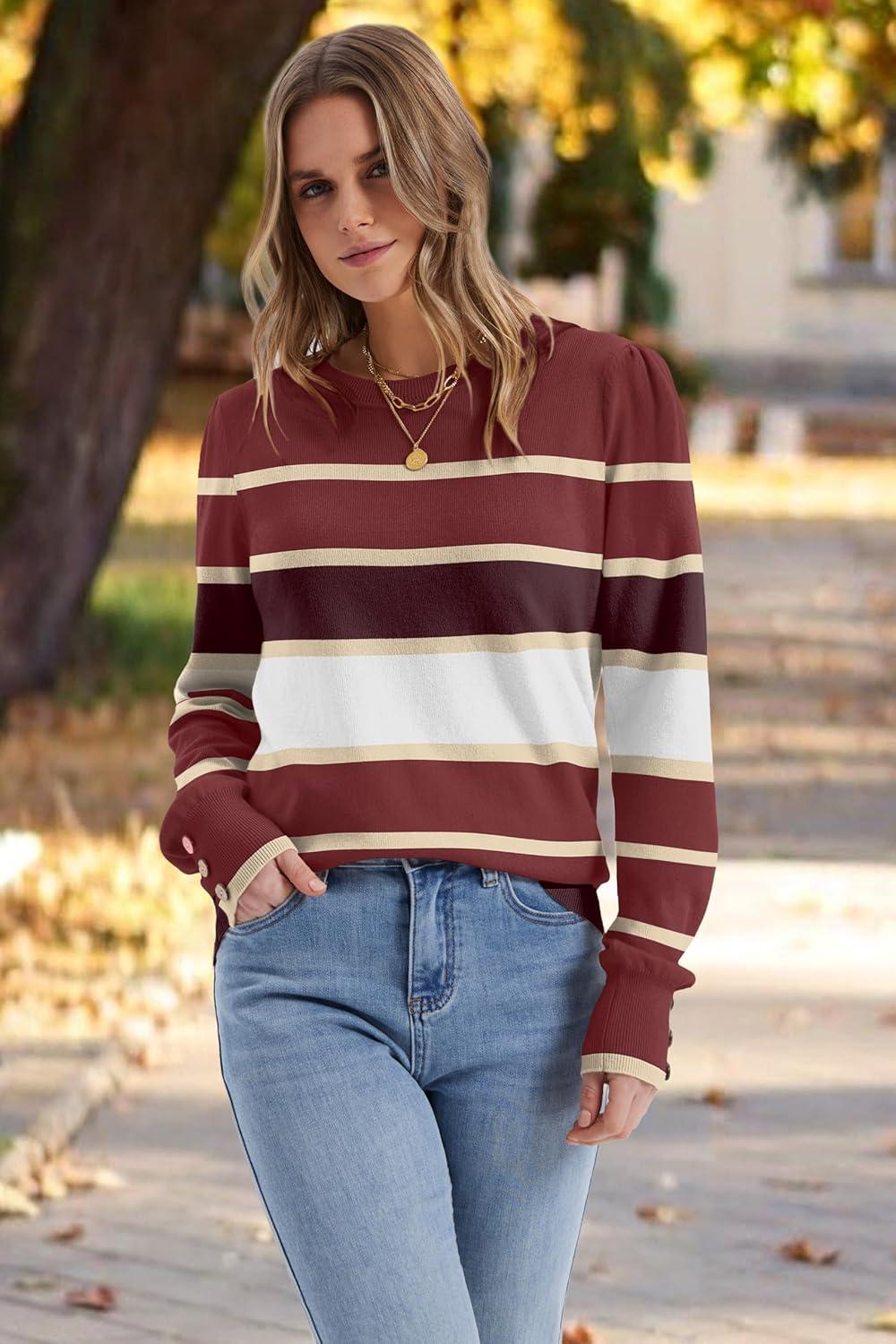 Womens Sweaters Fall Fashion 2025 Long Sleeve Button Cuff Soft Knit Pullover Trendy Tops Dressy Casual Blouses(Colored Stripes 1)