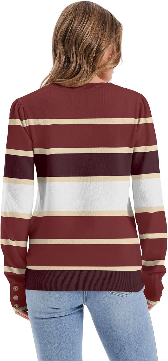 imageWomens Sweaters Fall Fashion 2025 Long Sleeve Button Cuff Soft Knit Pullover Trendy Tops Dressy Casual BlousesColored Stripes 2