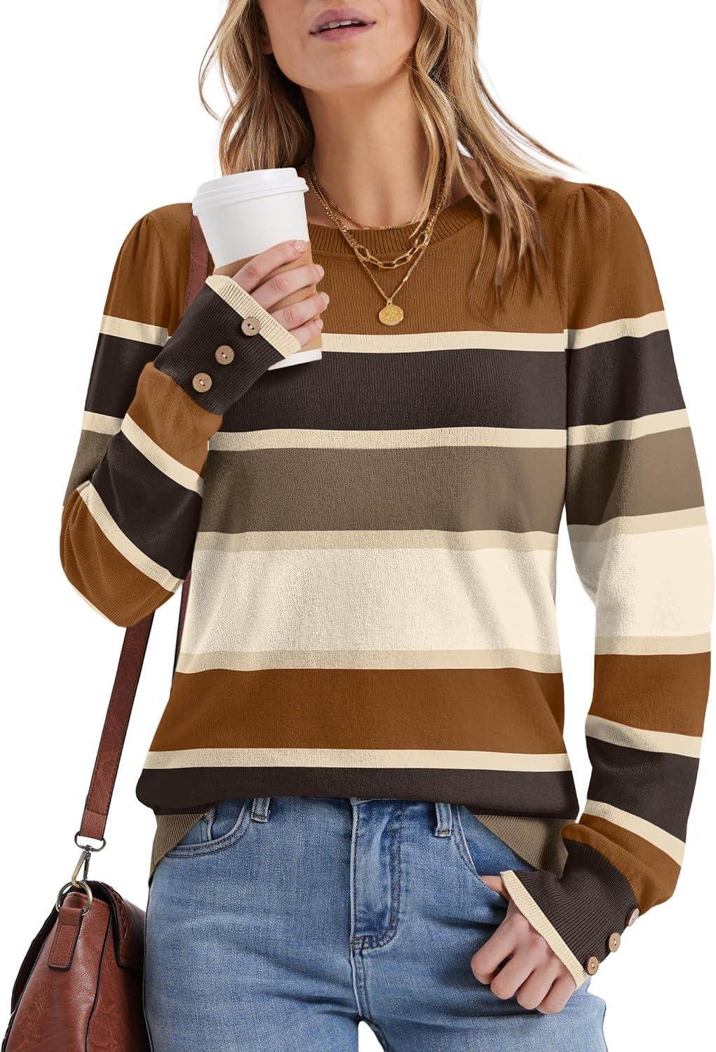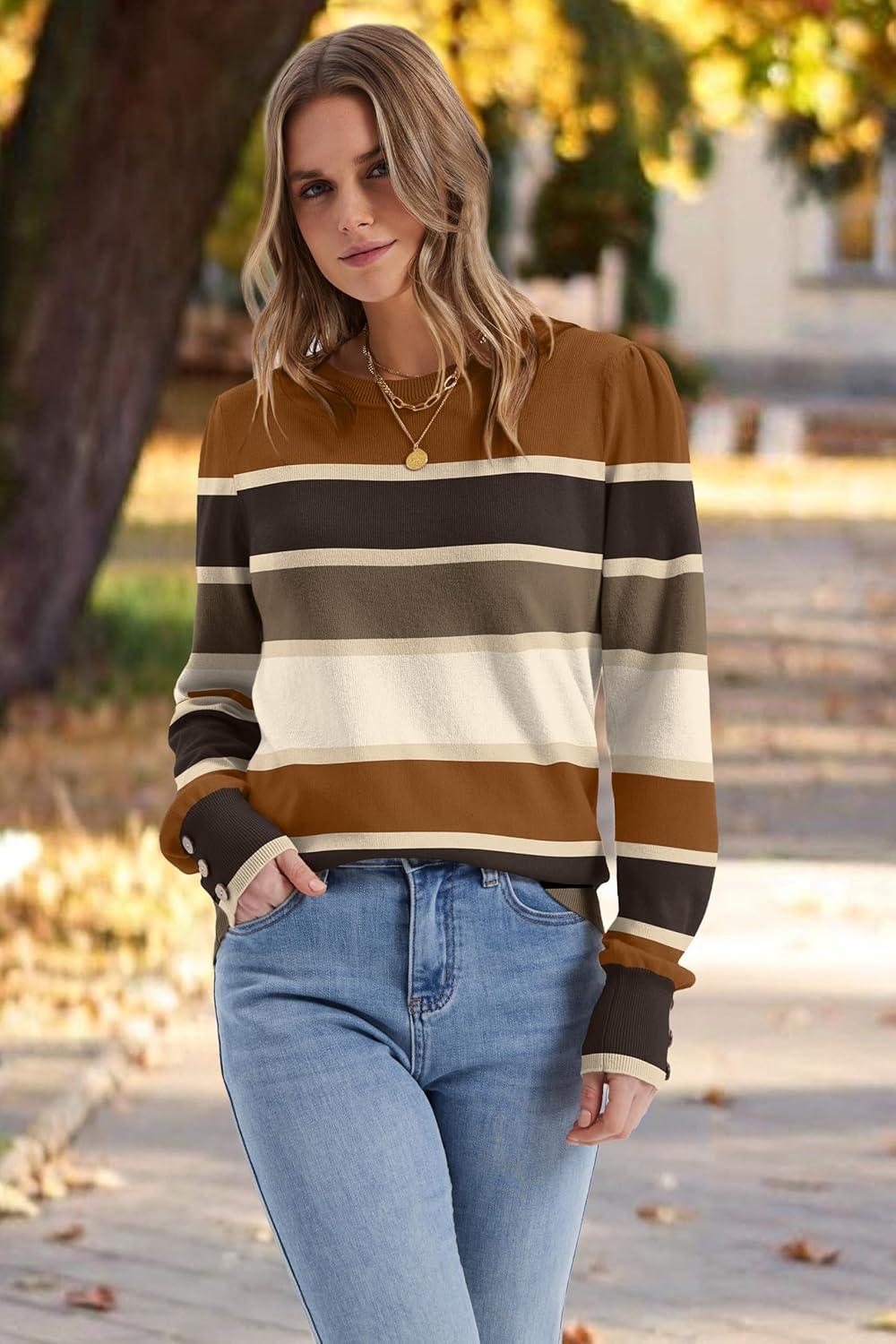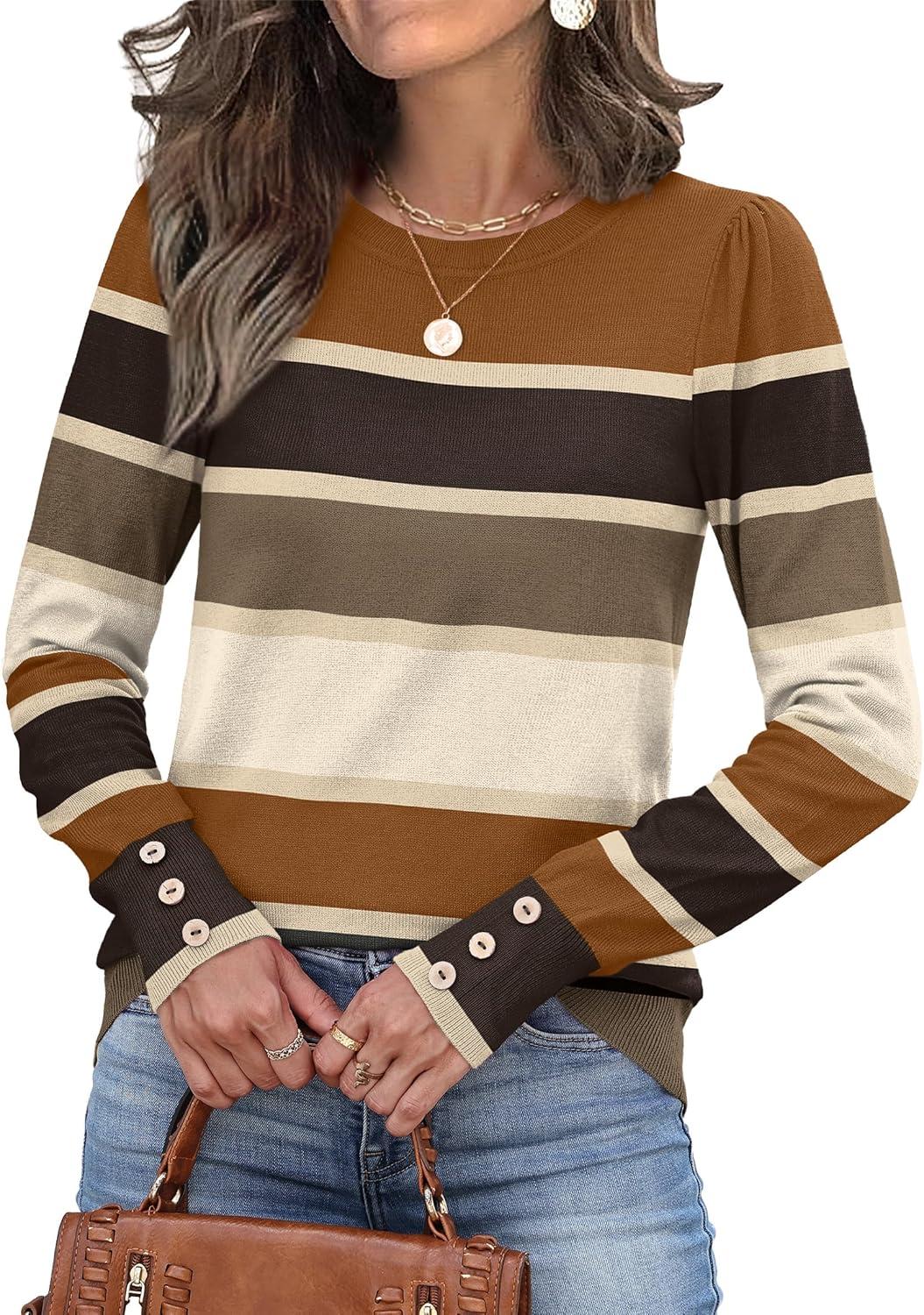 Womens Sweaters Fall Fashion 2025 Long Sleeve Button Cuff Soft Knit Pullover Trendy Tops Dressy Casual Blouses(Colored Stripes 1)