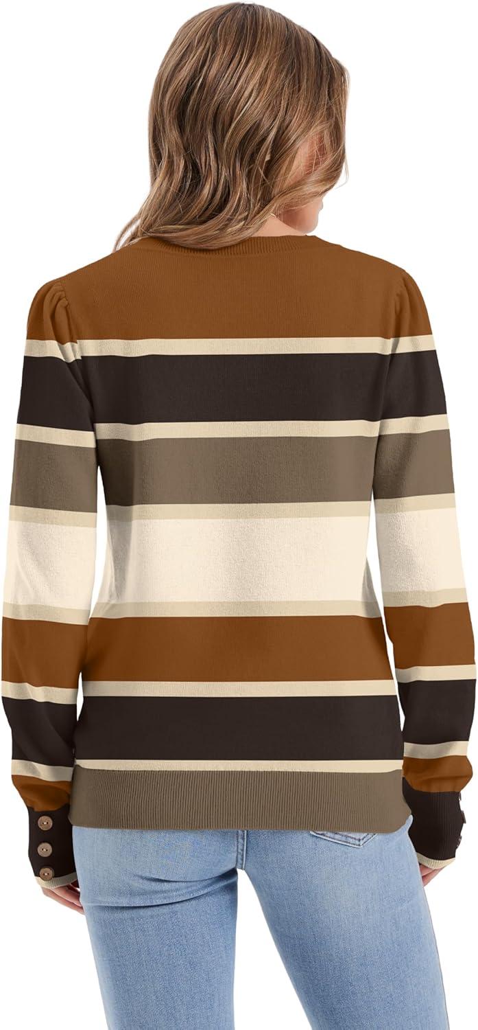 imageWomens Sweaters Fall Fashion 2025 Long Sleeve Button Cuff Soft Knit Pullover Trendy Tops Dressy Casual BlousesColored Stripes 2