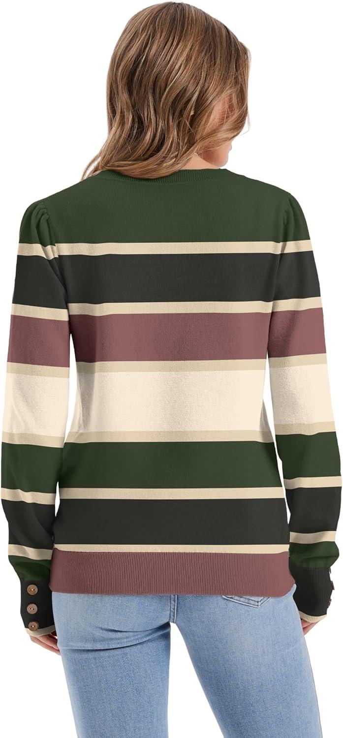 imageWomens Sweaters Fall Fashion 2025 Long Sleeve Button Cuff Soft Knit Pullover Trendy Tops Dressy Casual BlousesColored Stripes 2