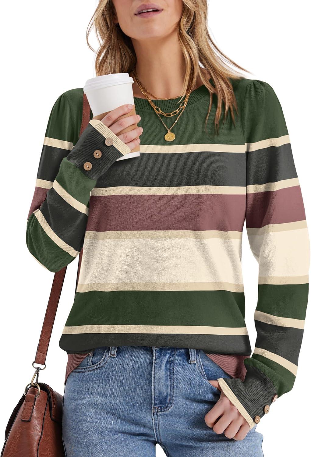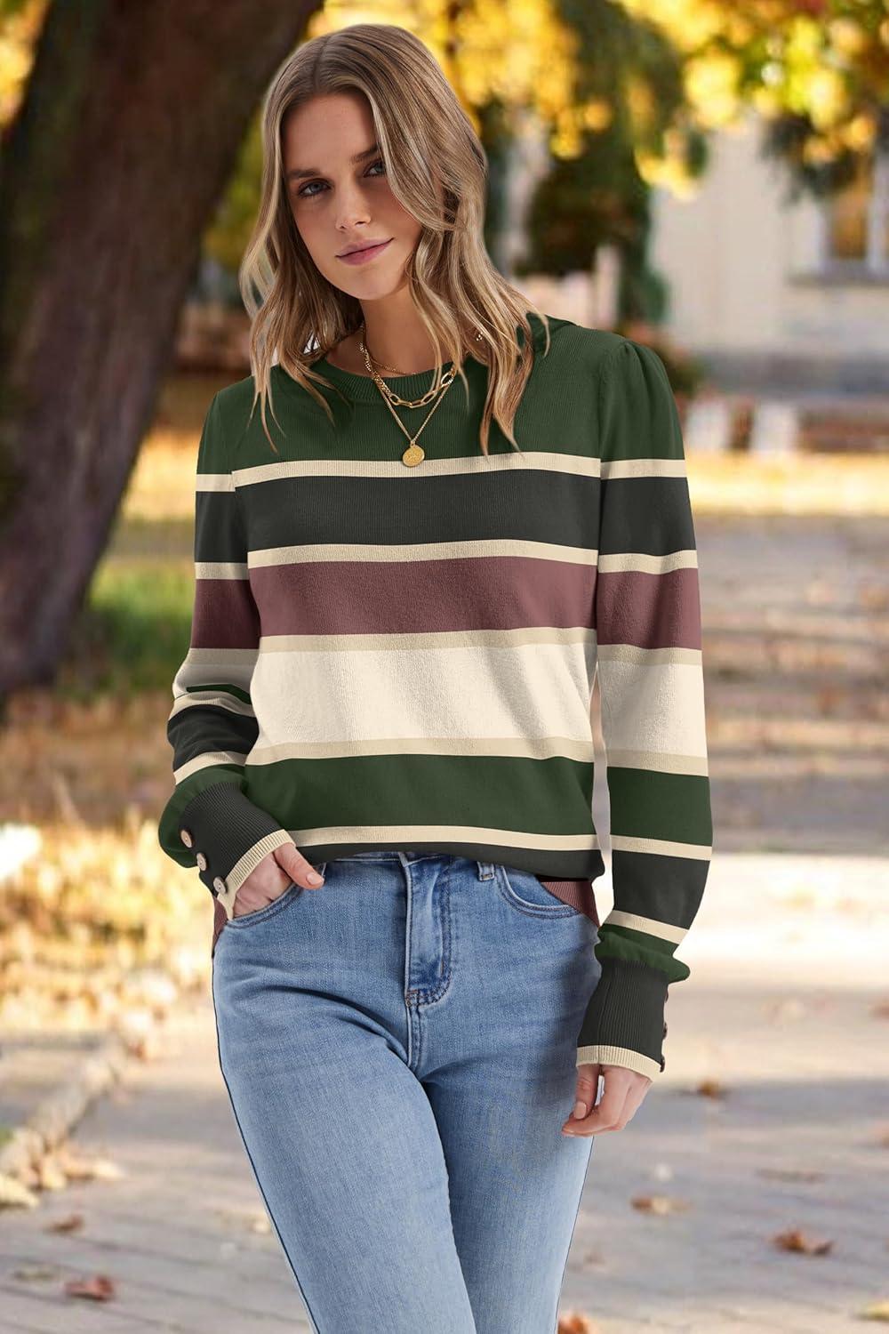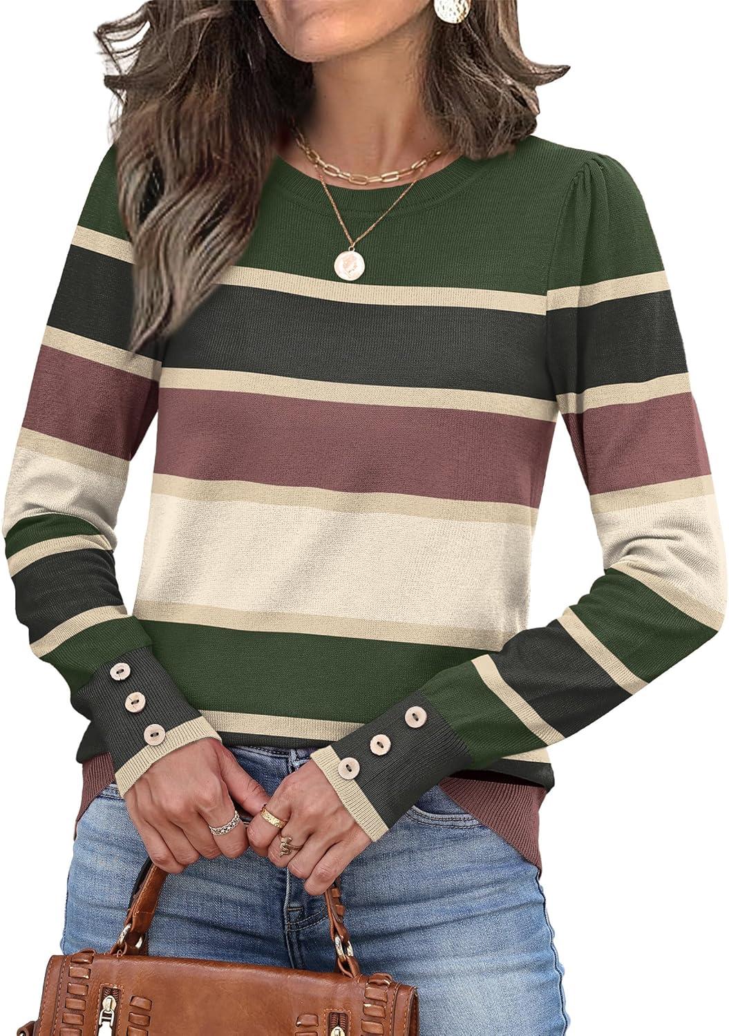 Womens Sweaters Fall Fashion 2025 Long Sleeve Button Cuff Soft Knit Pullover Trendy Tops Dressy Casual Blouses(Colored Stripes 2)