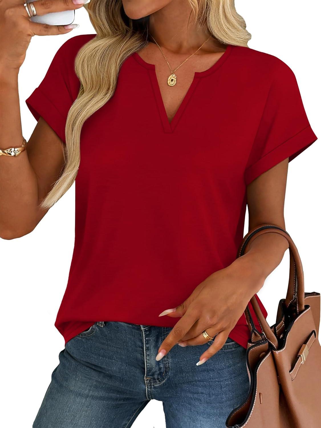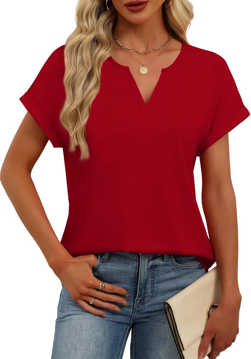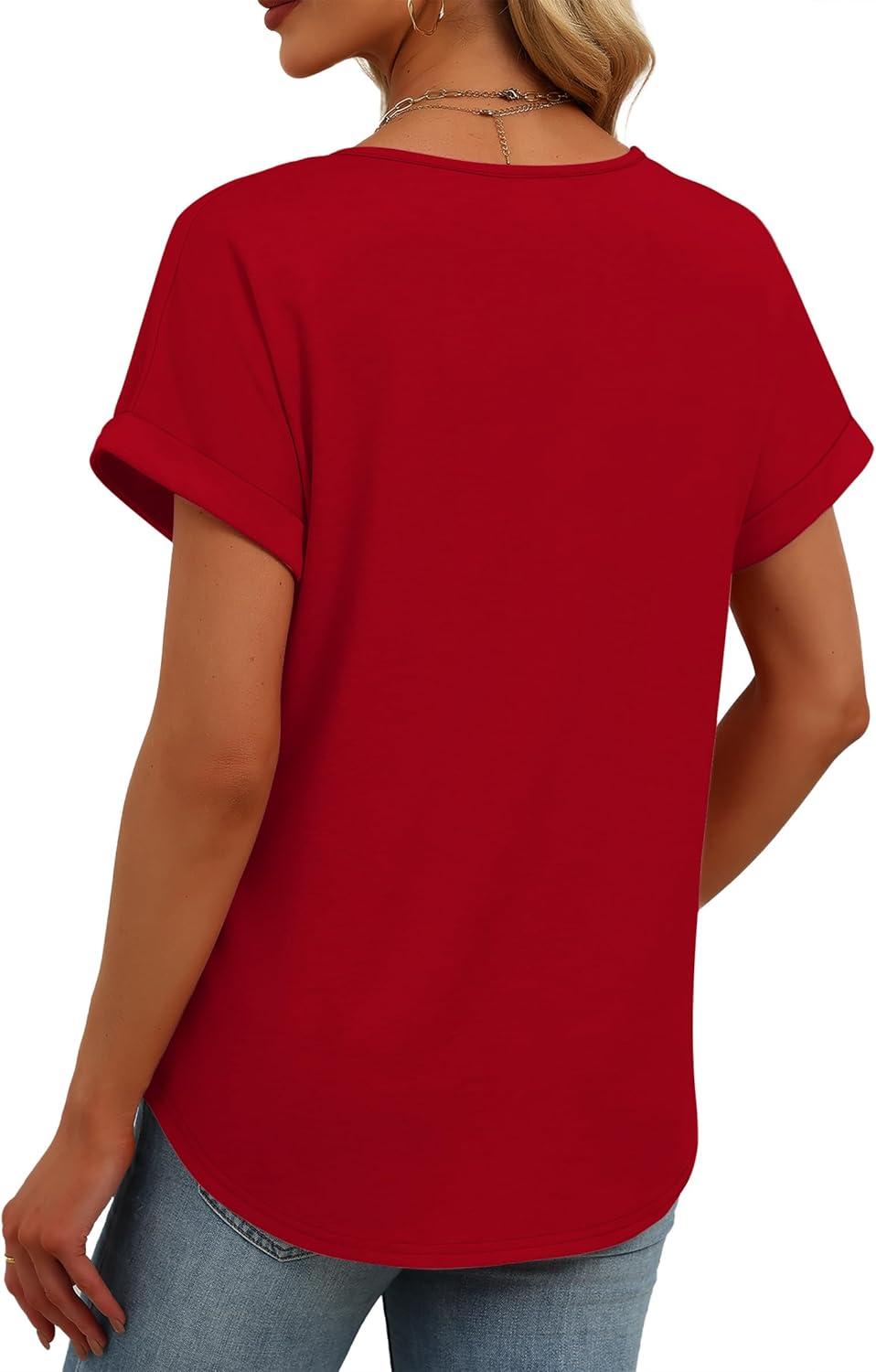 Womens Tops Dressy Casual V Neck Rolled Sleeve T Shirts Fashion Clothing Business Casual Outfits Beach Vacation Clothes(H-red)