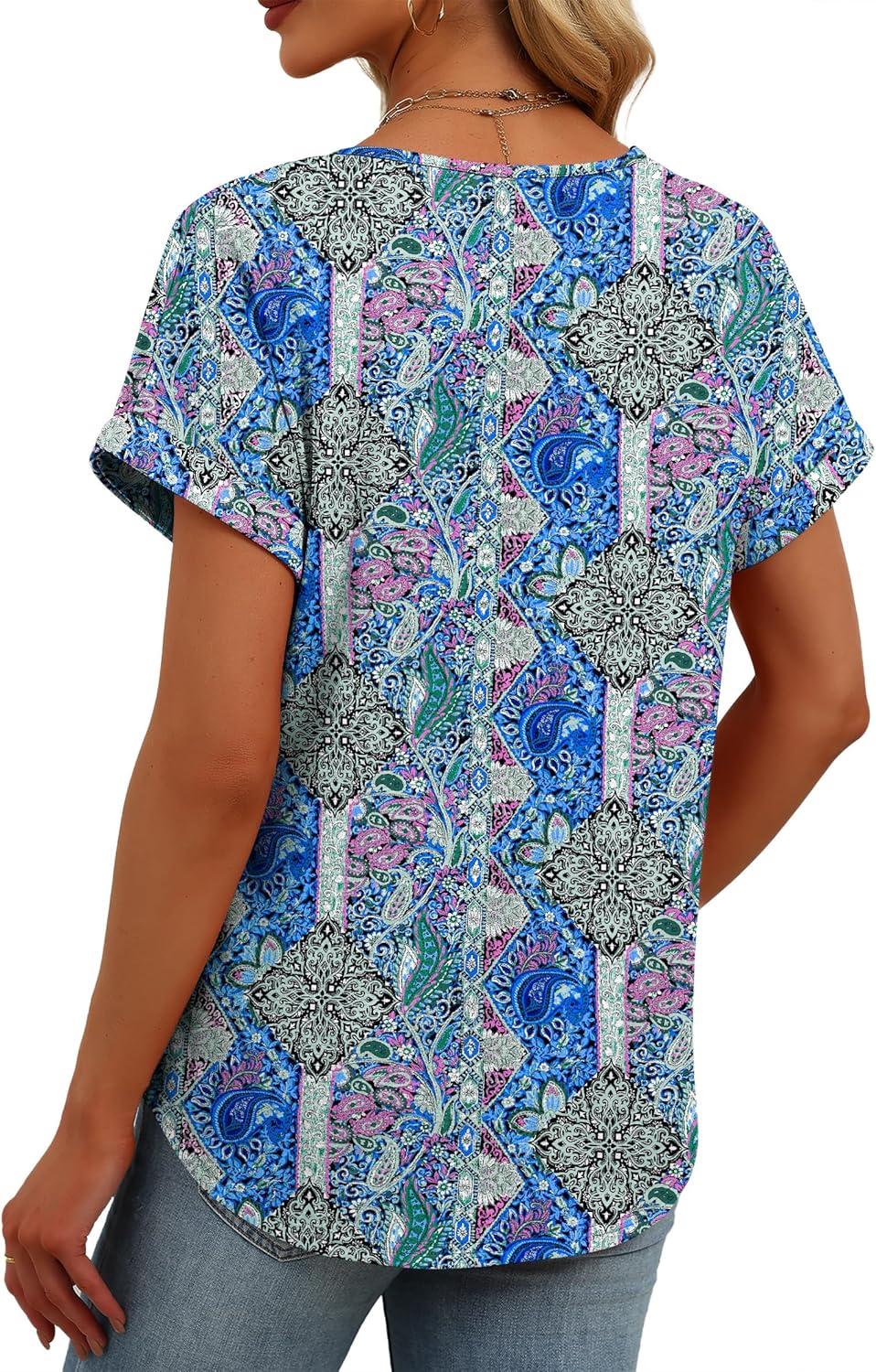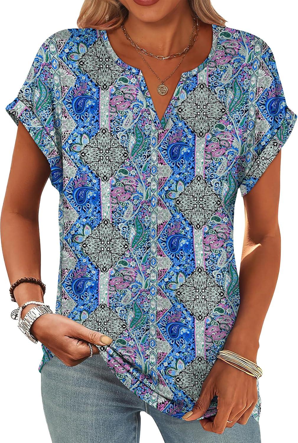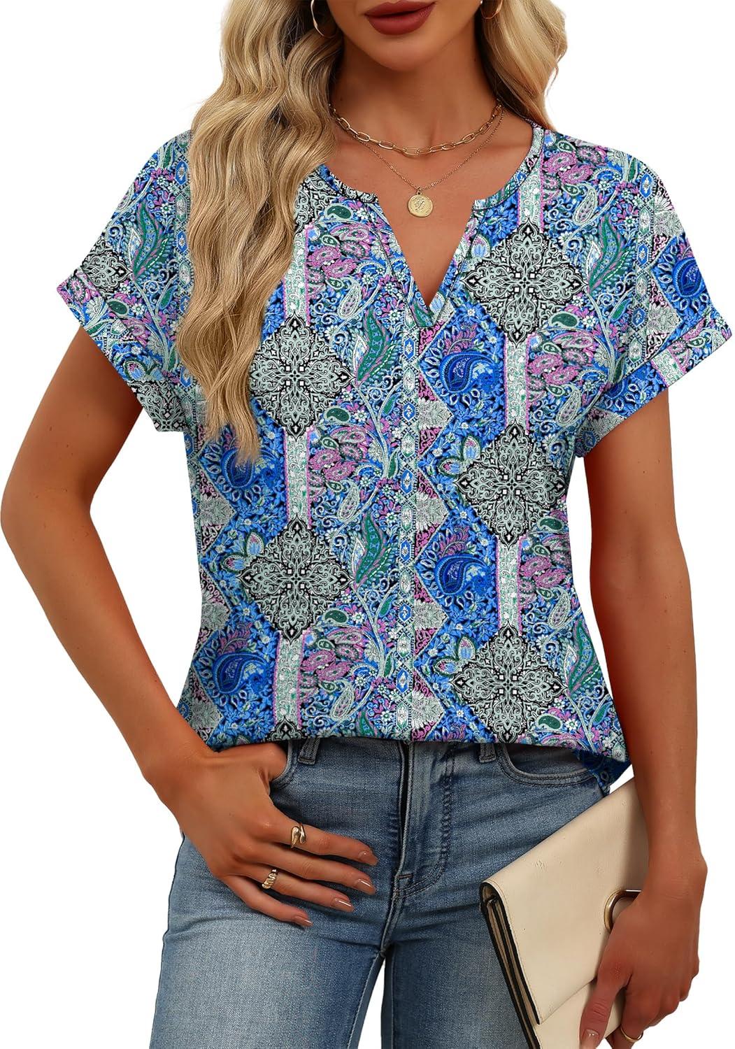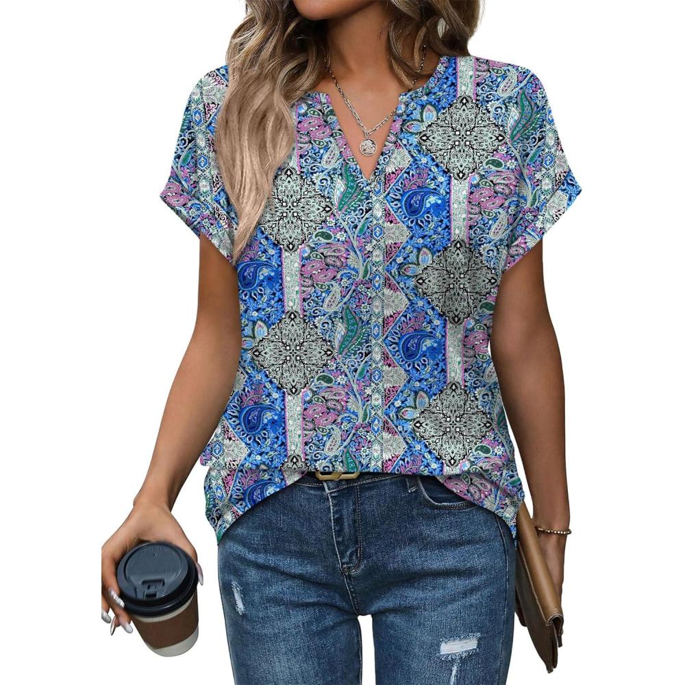 Womens Tops Dressy Casual V Neck Rolled Sleeve T Shirts Fashion Clothing Business Casual Outfits Beach Vacation Clothes(J-blue Purple Pattern)