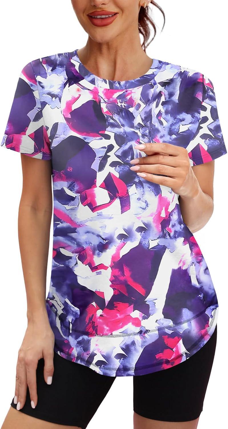 Womens Workout Tops Short Sleeve Shirts with Sun Protection UPF 50+ Quick Dry Outfits for Hiking Running S-3XL(13 Tie Dye Purple Floral)
