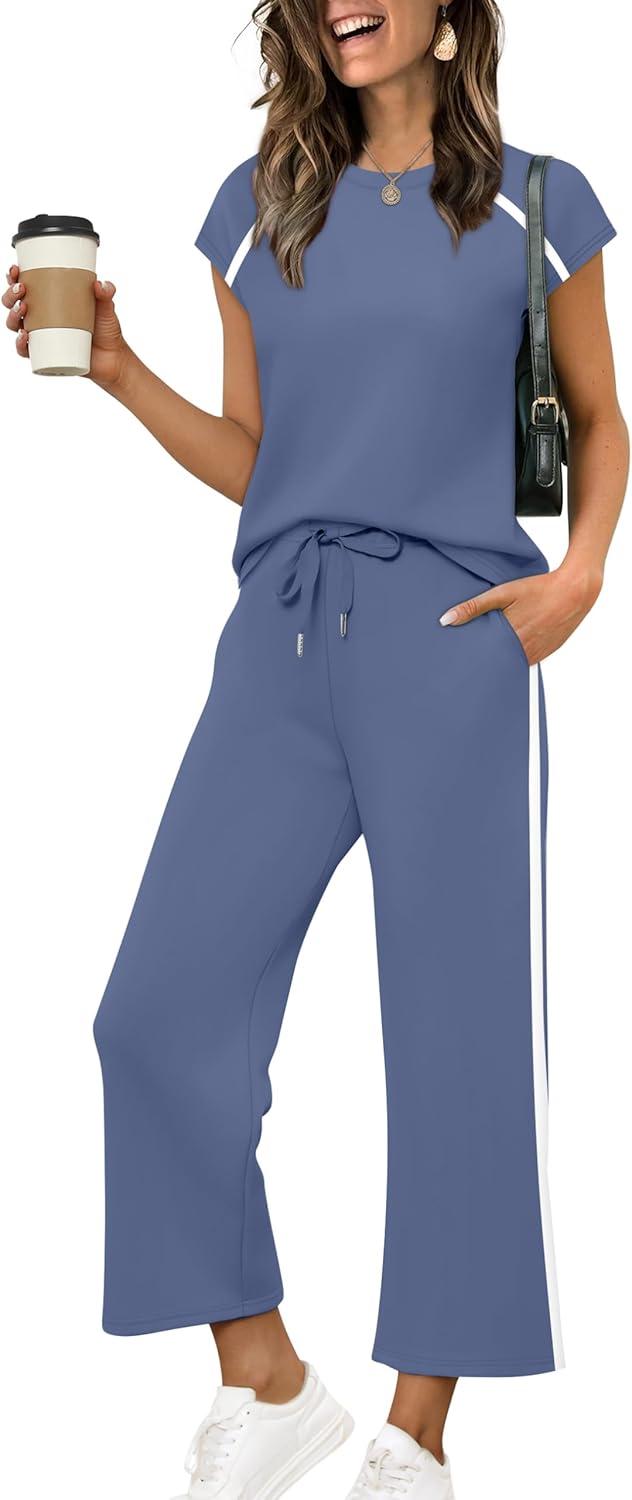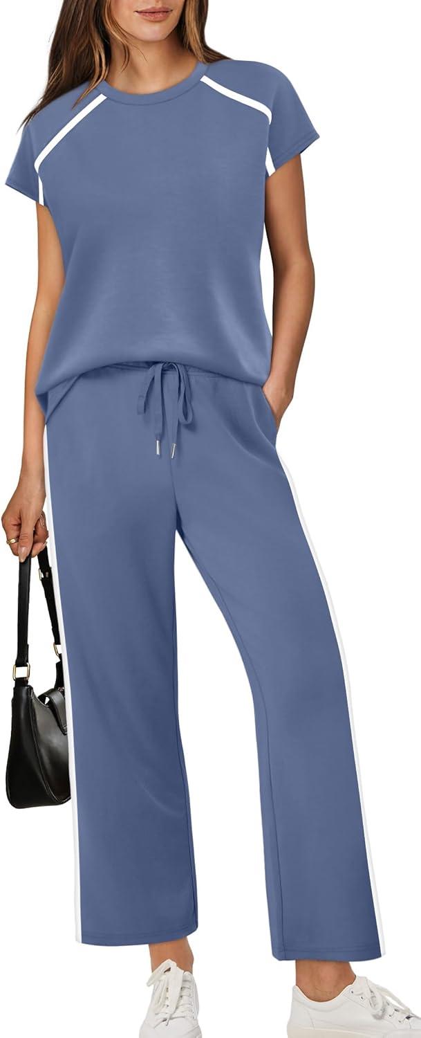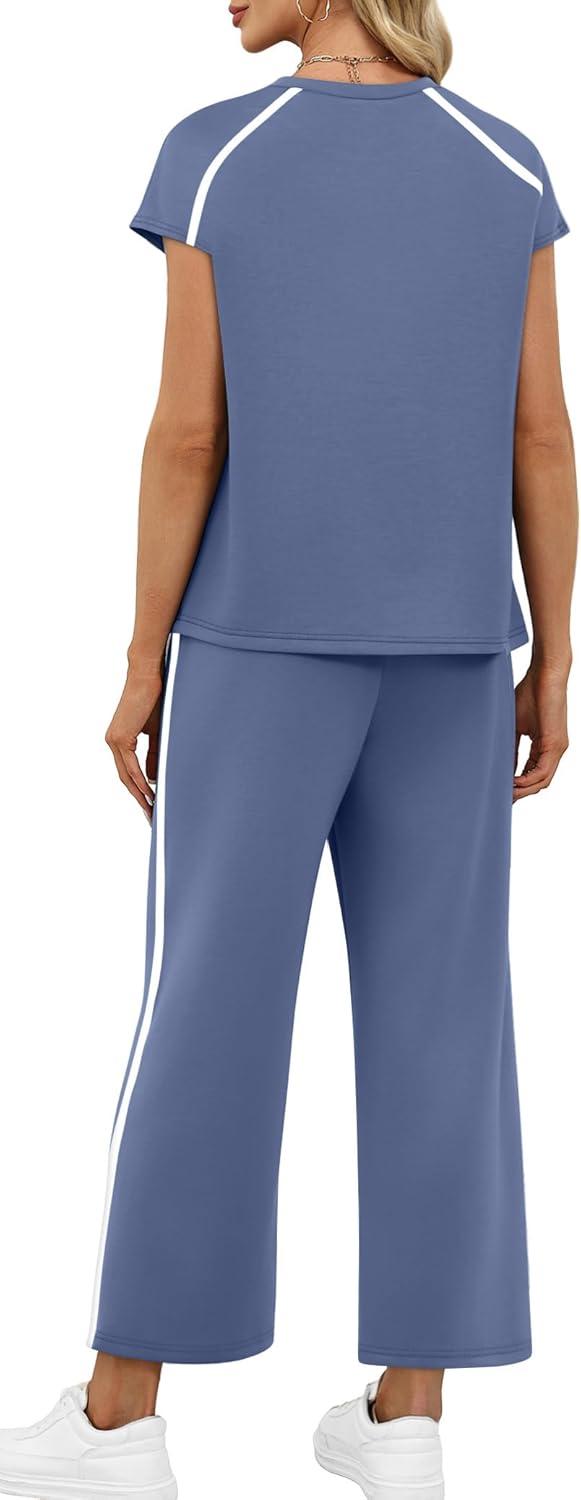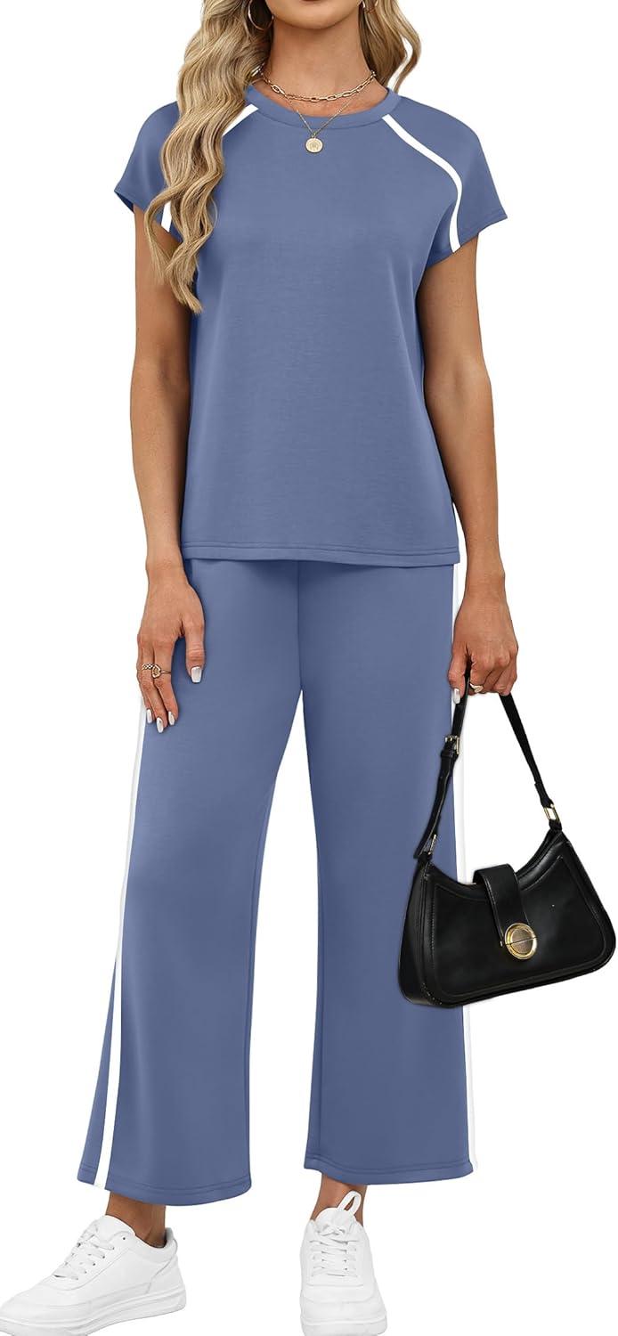 Design:Two Piece Sets for Women, Crew Neck Cap Sleeve Tops,Wide Leg Long Pants for free movement during various activities, from workouts to casual outings. Contoured Back for The Most Flattering Rear View