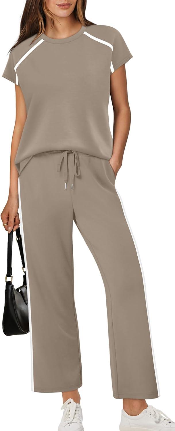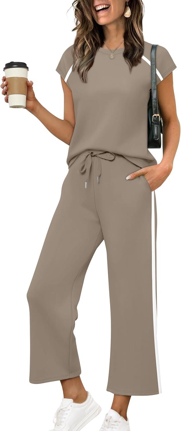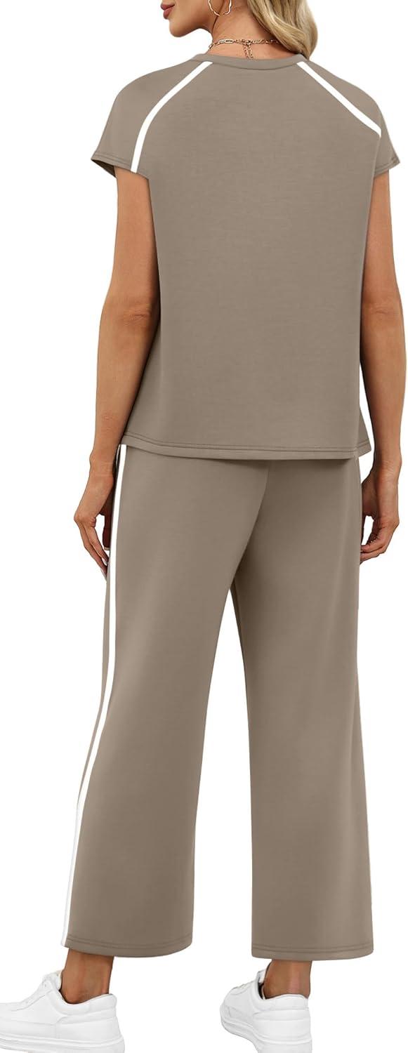 Design:Two Piece Sets for Women, Crew Neck Cap Sleeve Tops,Wide Leg Long Pants for free movement during various activities, from workouts to casual outings. Contoured Back for The Most Flattering Rear View
