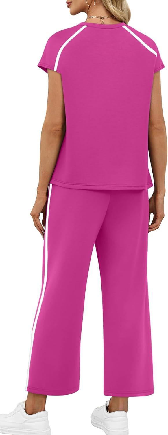 Design:Two Piece Sets for Women, Crew Neck Cap Sleeve Tops,Wide Leg Long Pants for free movement during various activities, from workouts to casual outings. Contoured Back for The Most Flattering Rear View