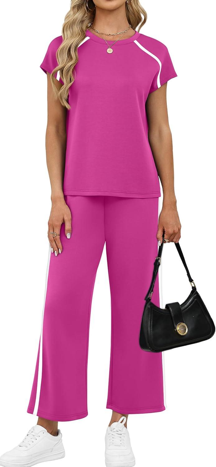 XIEERDUO 2 Piece Sets for Women Crew Neck Travel Airport Outfits Summer Fashion Clothing Cap Sleeve Tops Wide Legs Pants Set(Hot Pink)