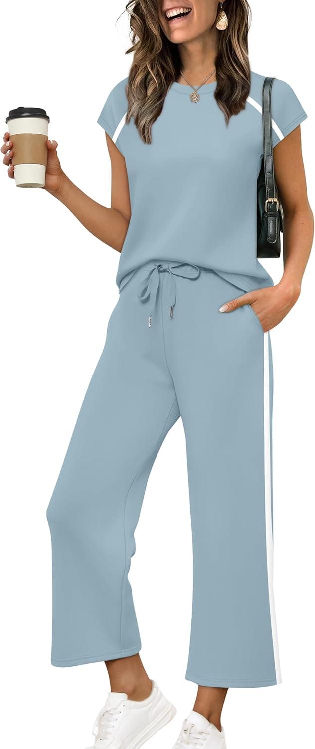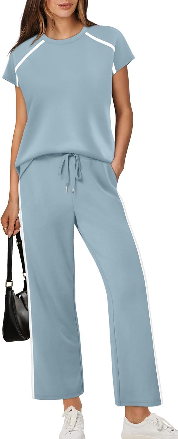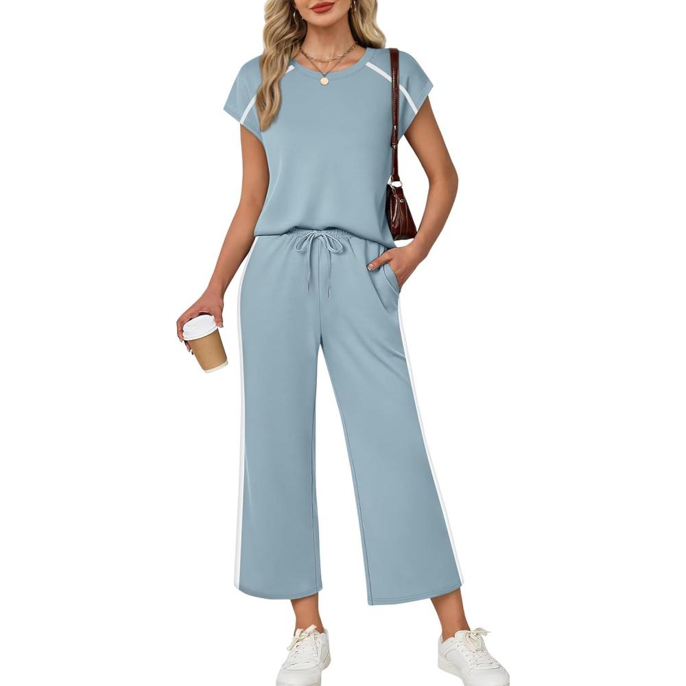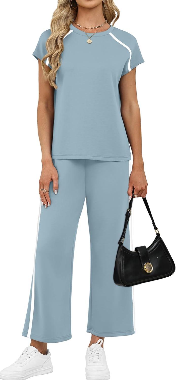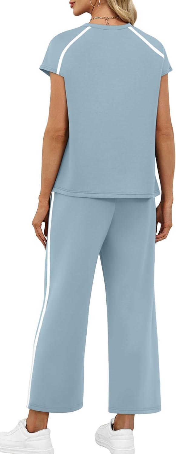 Design:Two Piece Sets for Women, Crew Neck Cap Sleeve Tops,Wide Leg Long Pants for free movement during various activities, from workouts to casual outings. Contoured Back for The Most Flattering Rear View