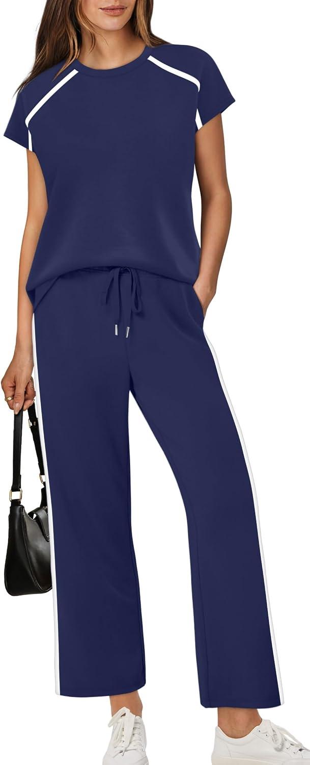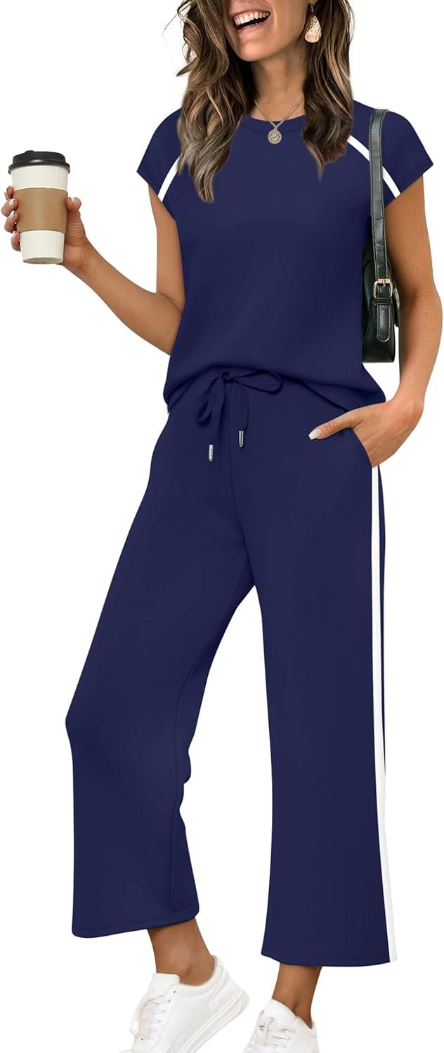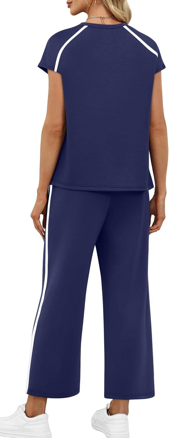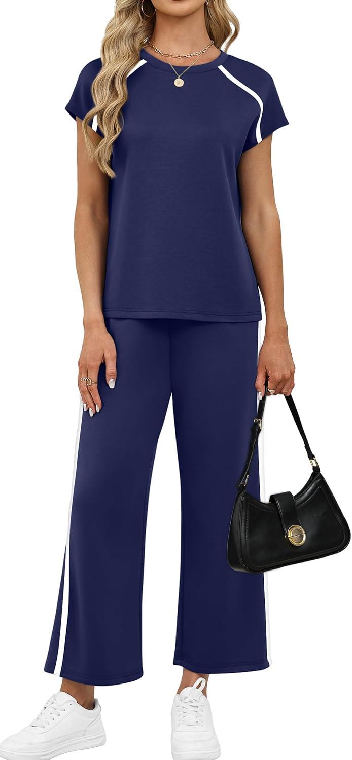 Design:Two Piece Sets for Women, Crew Neck Cap Sleeve Tops,Wide Leg Long Pants for free movement during various activities, from workouts to casual outings. Contoured Back for The Most Flattering Rear View