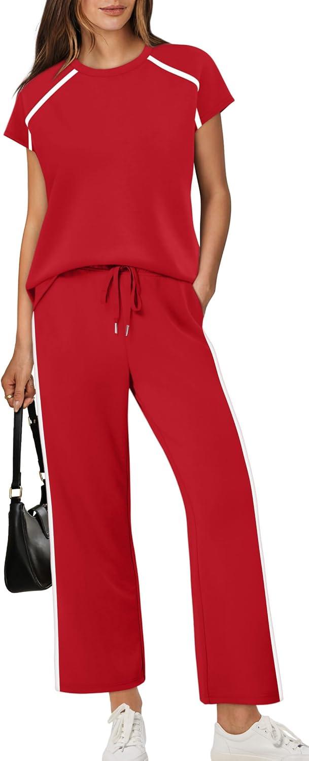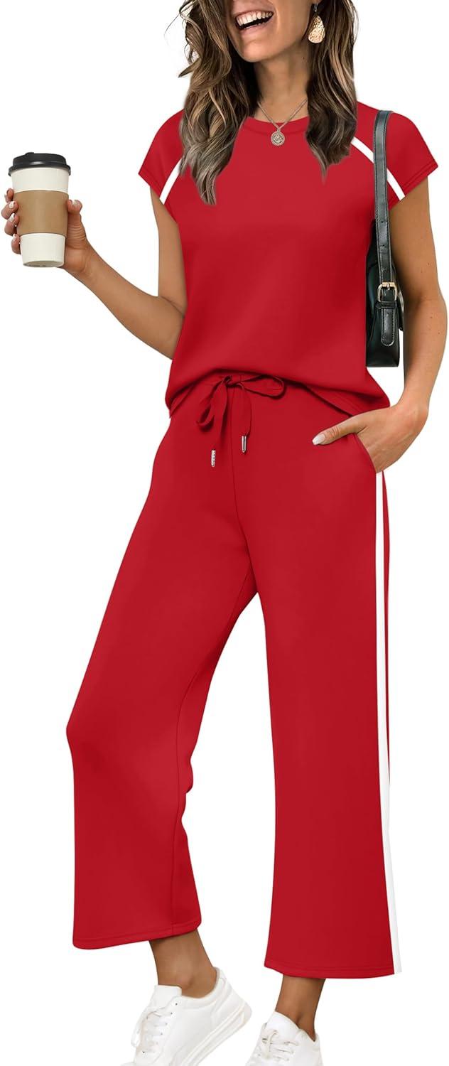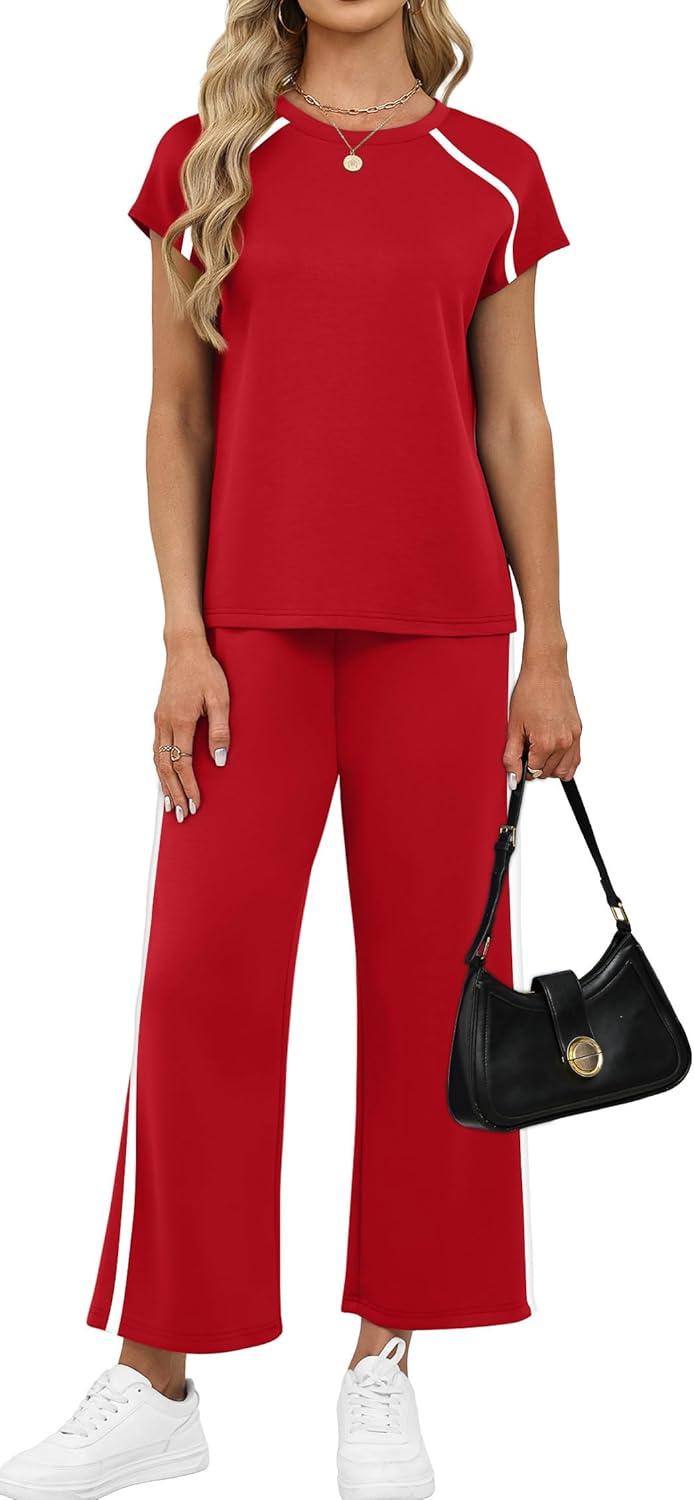 XIEERDUO 2 Piece Sets for Women Crew Neck Travel Airport Outfits Summer Fashion Clothing Cap Sleeve Tops Wide Legs Pants Set(Red)