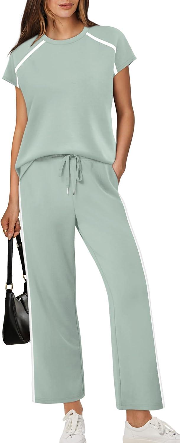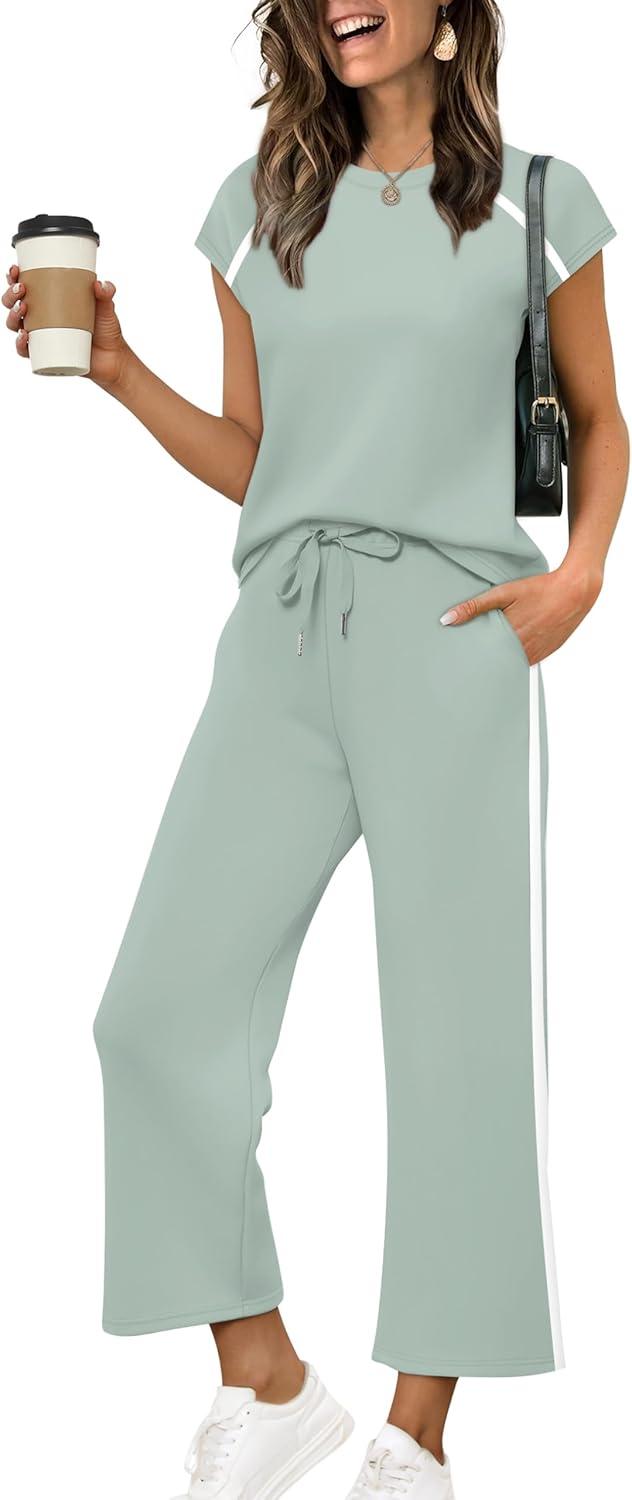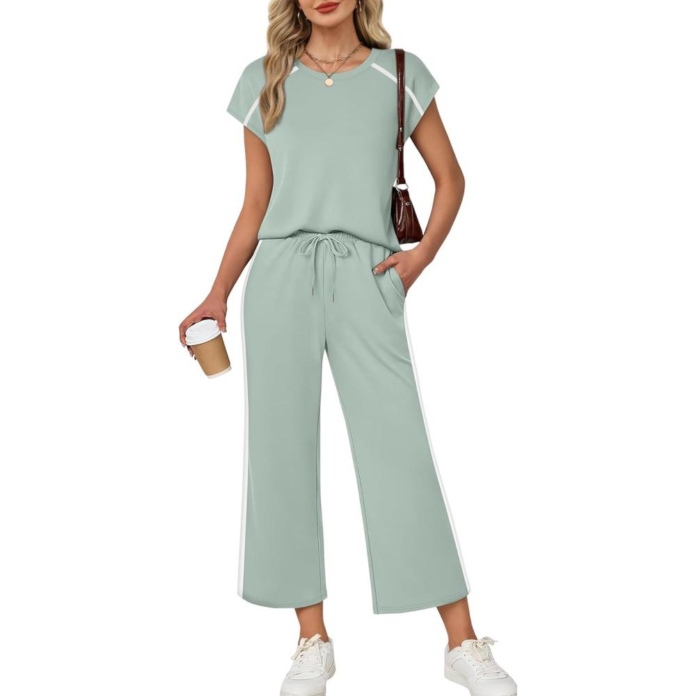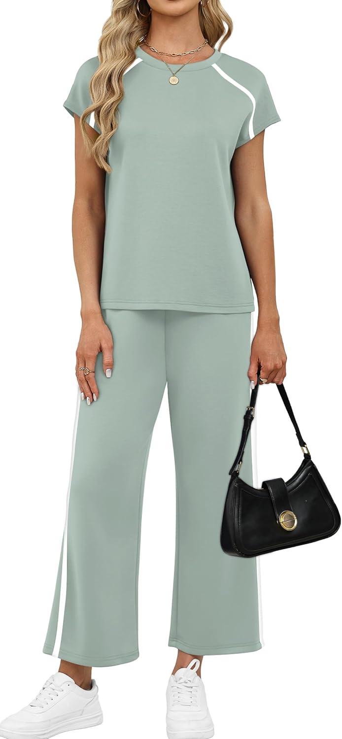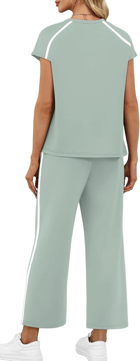 Design:Two Piece Sets for Women, Crew Neck Cap Sleeve Tops,Wide Leg Long Pants for free movement during various activities, from workouts to casual outings. Contoured Back for The Most Flattering Rear View