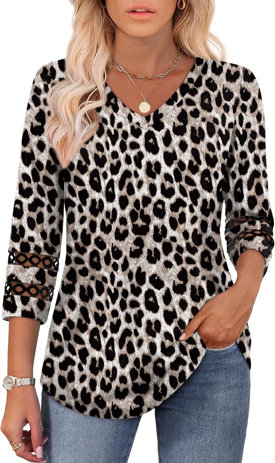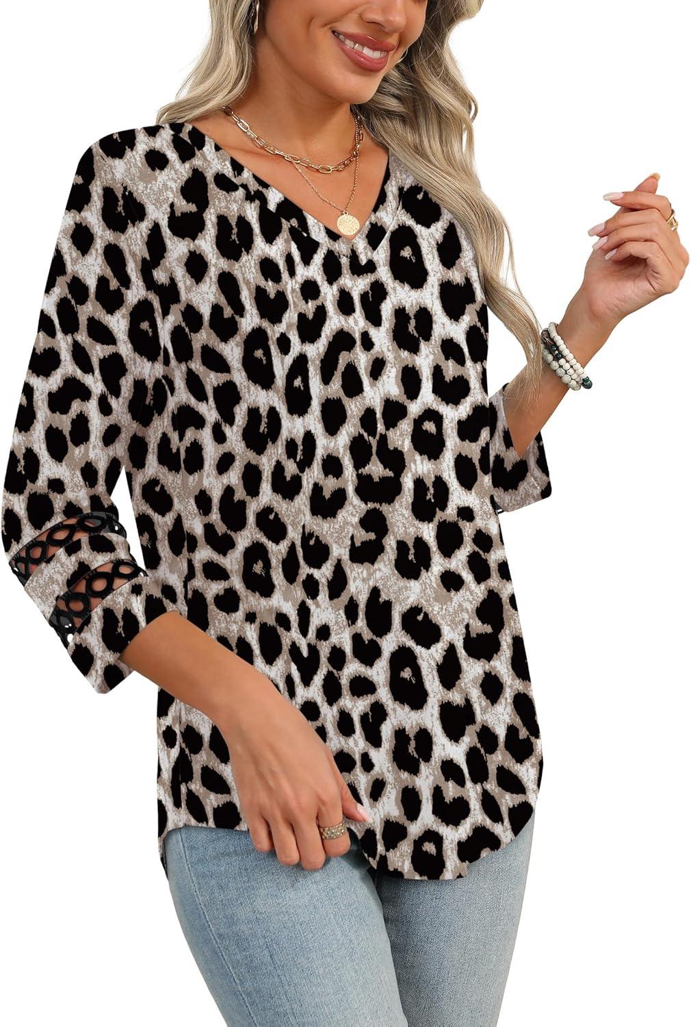 XIEERDUO 3/4 Length Sleeve Womens Tops Dressy Casual Blouses for Women 2025 Trendy V Neck T Shirts Summer Clothes(Z Brown Leopard)