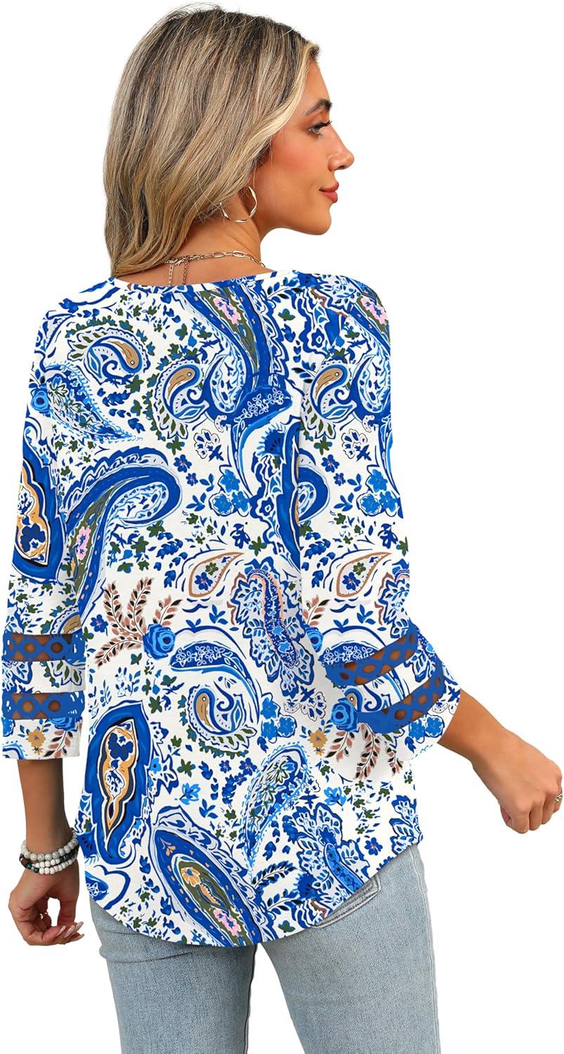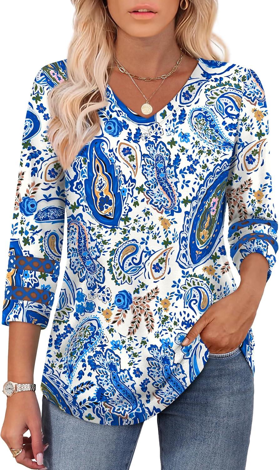 XIEERDUO 3/4 Length Sleeve Womens Tops Dressy Casual Blouses for Women 2026 Trendy V Neck T Shirts Summer Clothes(Z Blue Floral)