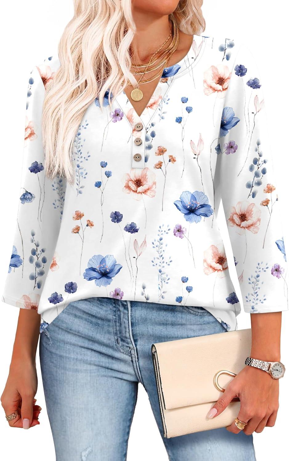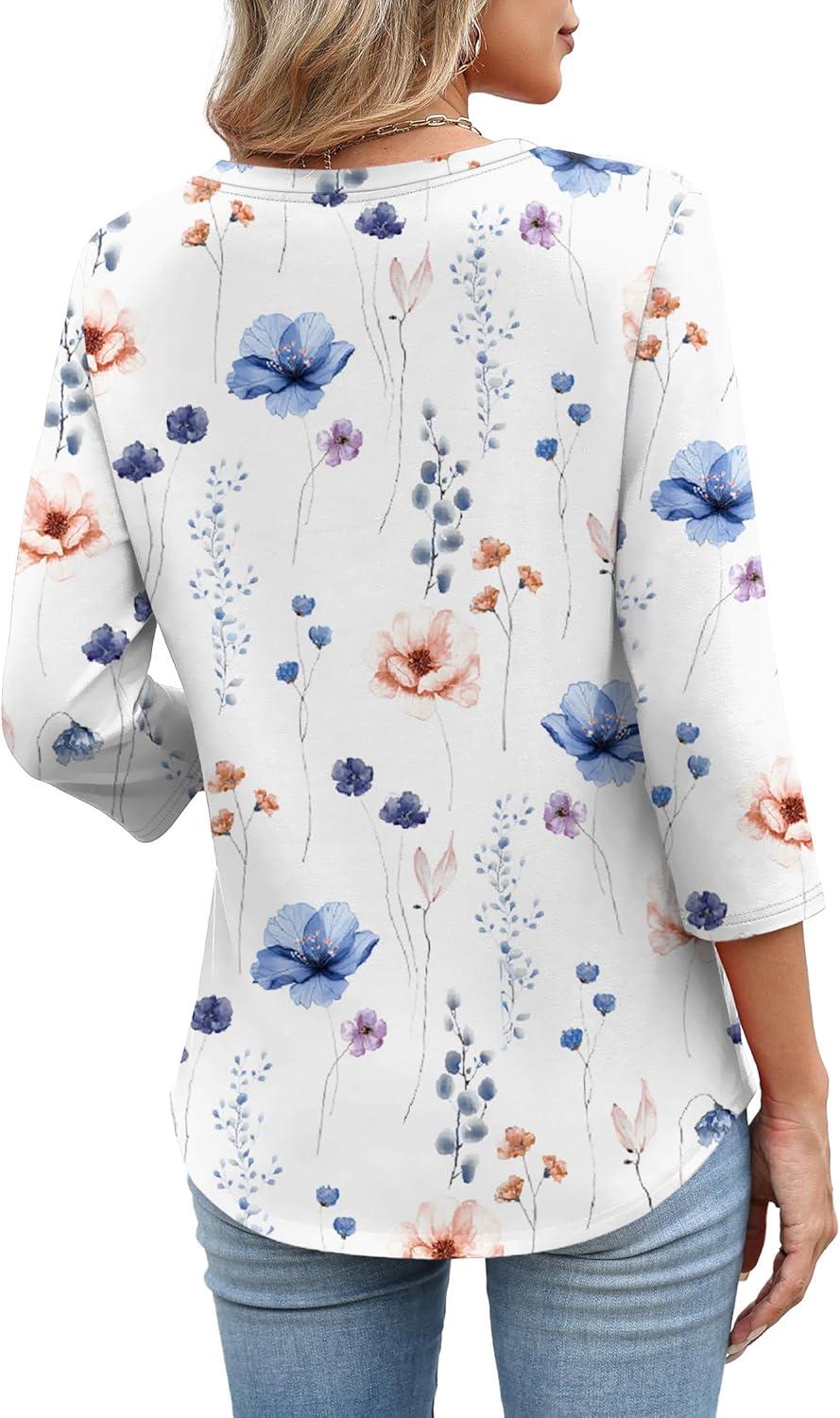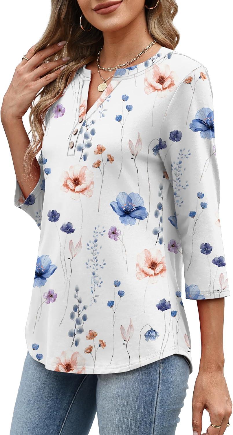 XIEERDUO 3/4 Length Sleeve Womens Tops Fashion Clothing V Neck T Shirts Dressy Blouses Business Casual Outfits Tunic Tops(J-white Floral)
