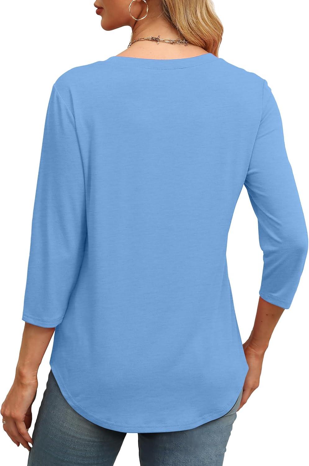 XIEERDUO 3/4 Length Sleeve Womens Tops Round Neck Casual Tunic Tops Basic Pleated Shirts Loose Fit 2026(Light Blue)