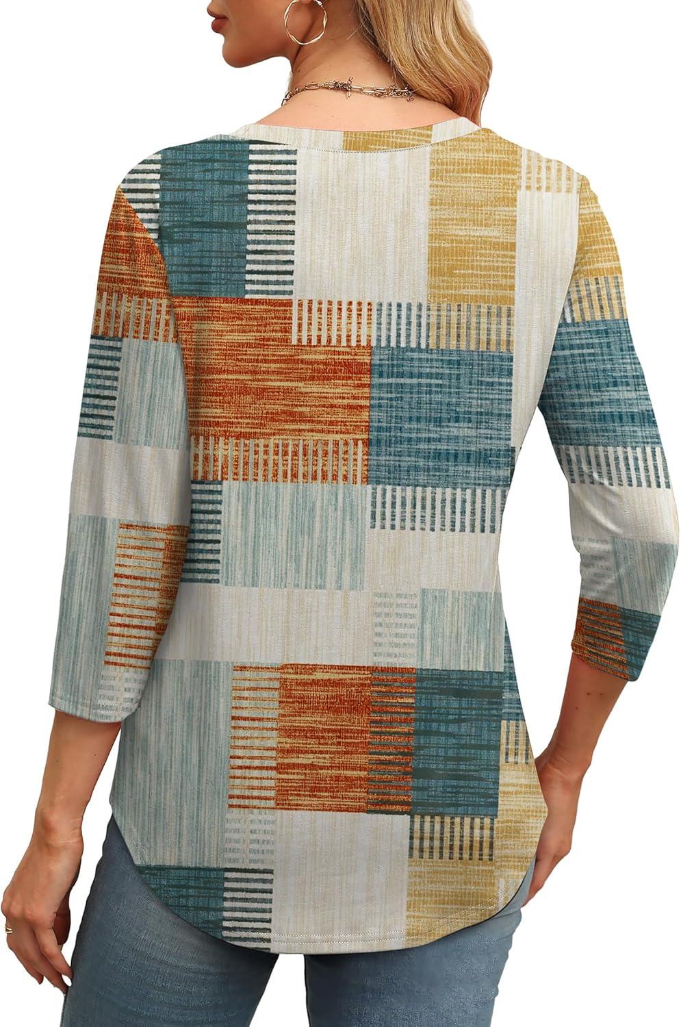 XIEERDUO 3/4 Length Sleeve Womens Tops Round Neck Casual Tunic Tops Basic Pleated Shirts Loose Fit 2026(Patterned-orange and Blue Plaid)