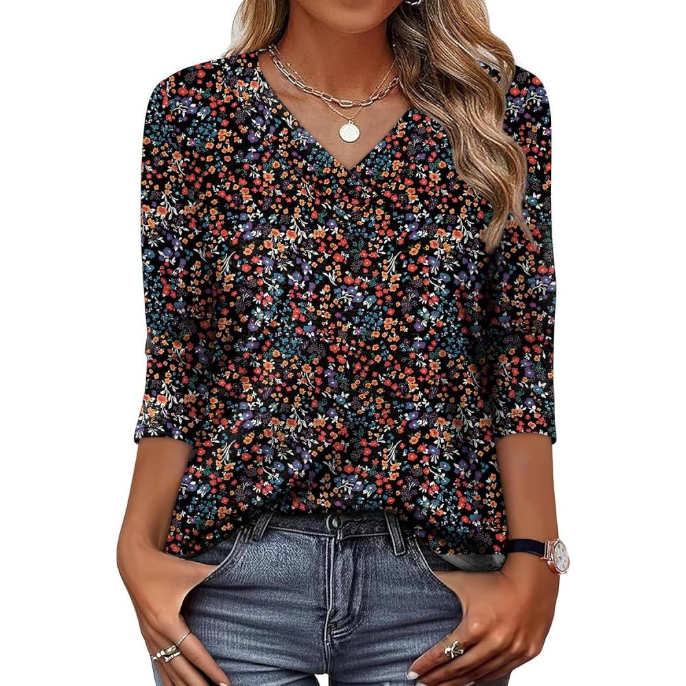 XIEERDUO 3/4 Length Sleeve Womens Tops V Neck T Shirts Summer Clothes Basic Blouses Dressy Casual 2026 Spring Outfits(Patterned-black Floral)