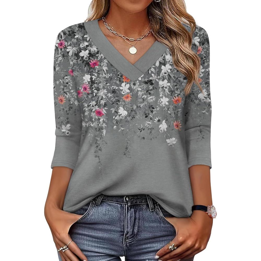 XIEERDUO 3/4 Length Sleeve Womens Tops V Neck T Shirts Summer Clothes Basic Blouses Dressy Casual 2026 Spring Outfits(Patterned-grey Floral)