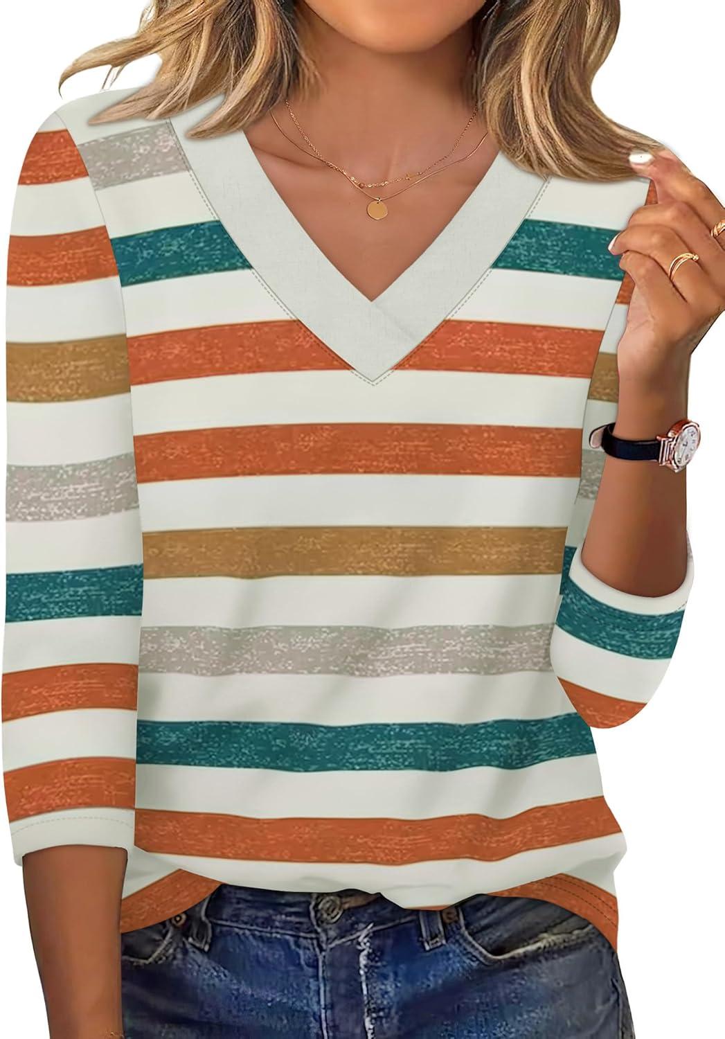 image:imageXIEERDUO 34 Length Sleeve Womens Tops V Neck T Shirts Summer Clothes Basic Blouses Dressy Casual 2026 Spring OutfitsPatternedmulticolor Stripe