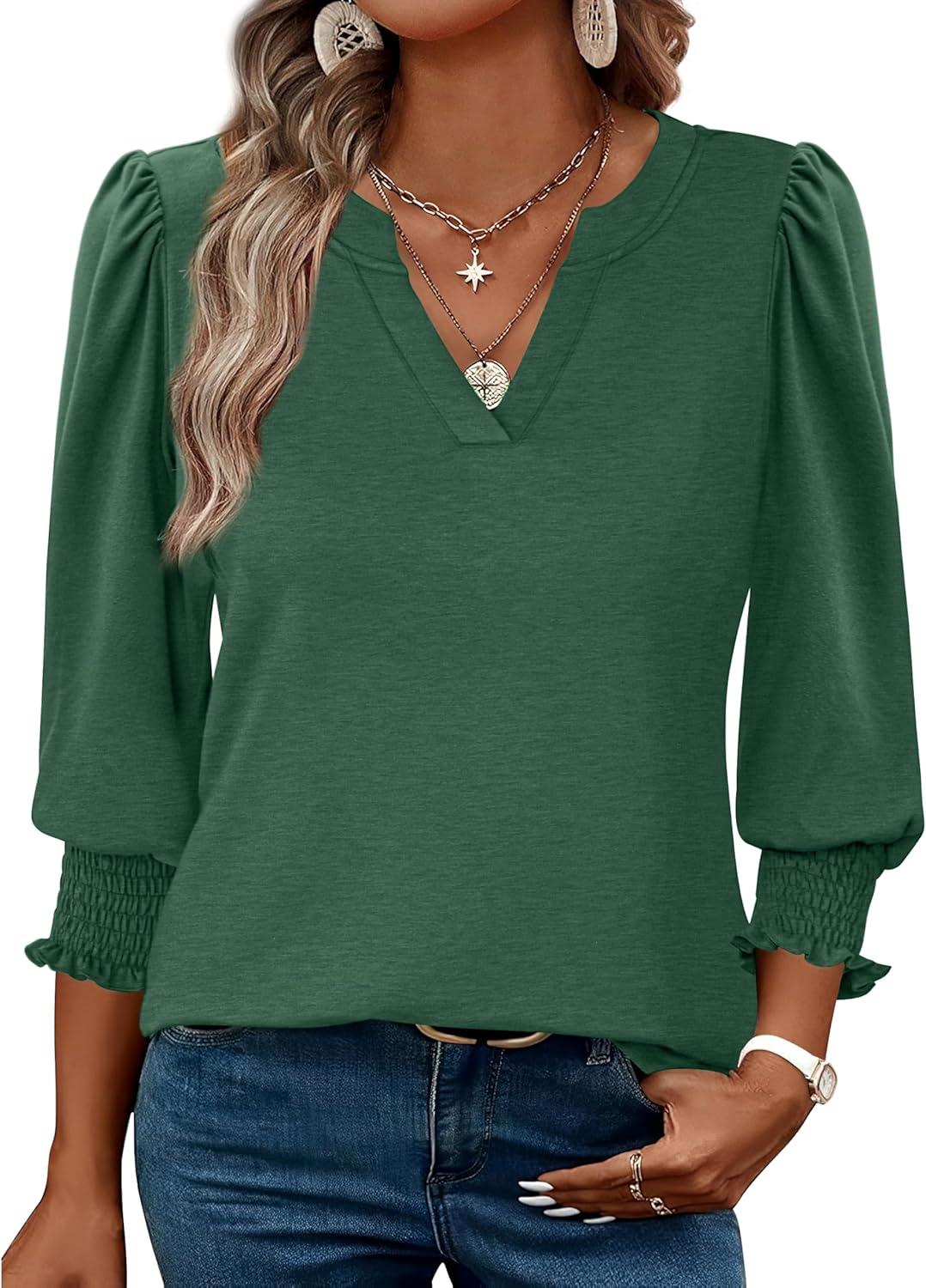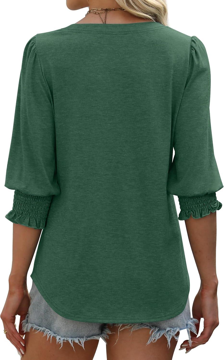 XIEERDUO Blouses for Women Dressy Casual 3/4 Length Sleeve Womens Tops V Neck T Shirts with Smocked Cuffs(Q-dark Green)