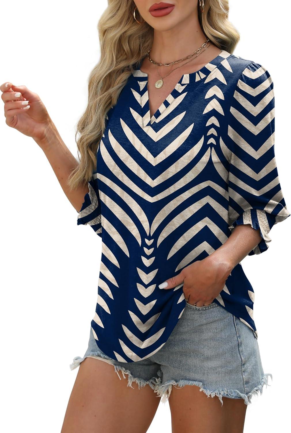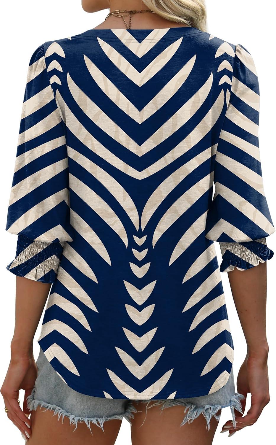 XIEERDUO Blouses for Women Dressy Casual 3/4 Length Sleeve Womens Tops V Neck T Shirts with Smocked Cuffs(R-navy Blue Stripes)