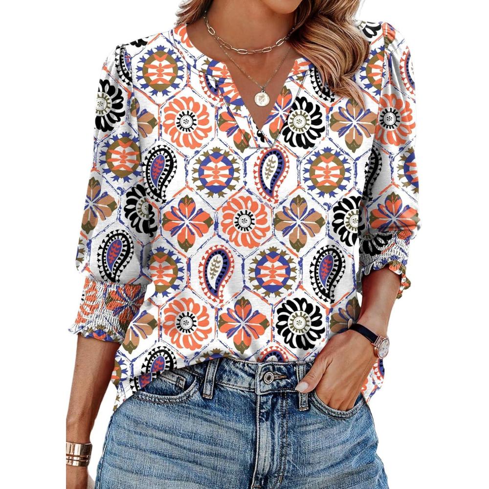 XIEERDUO Blouses for Women Dressy Casual 3/4 Length Sleeve Womens Tops V Neck T Shirts with Smocked Cuffs(V-colorful Print)