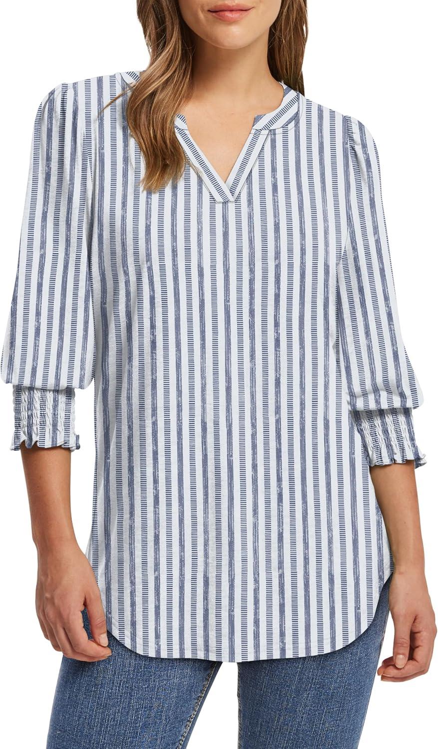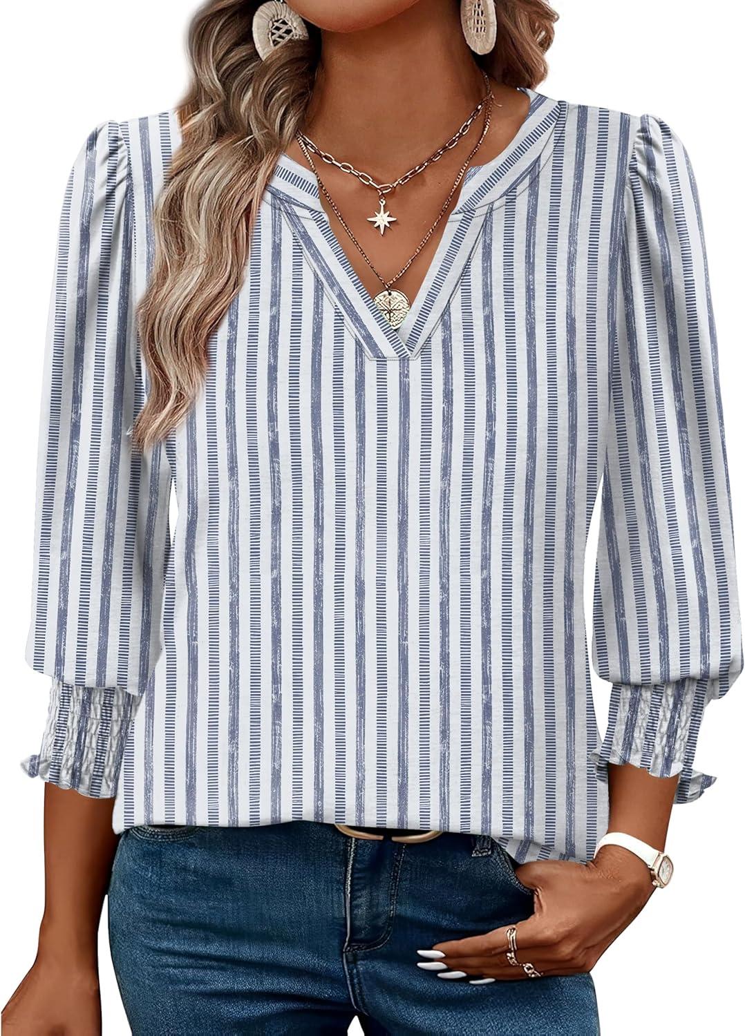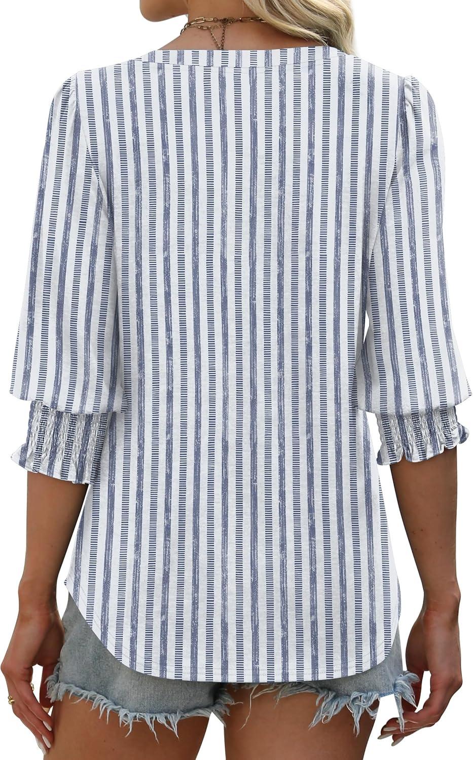 XIEERDUO Blouses for Women Dressy Casual 3/4 Length Sleeve Womens Tops V Neck T Shirts with Smocked Cuffs(W-blue Stripes)