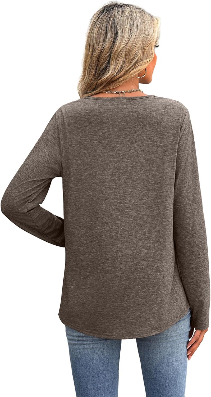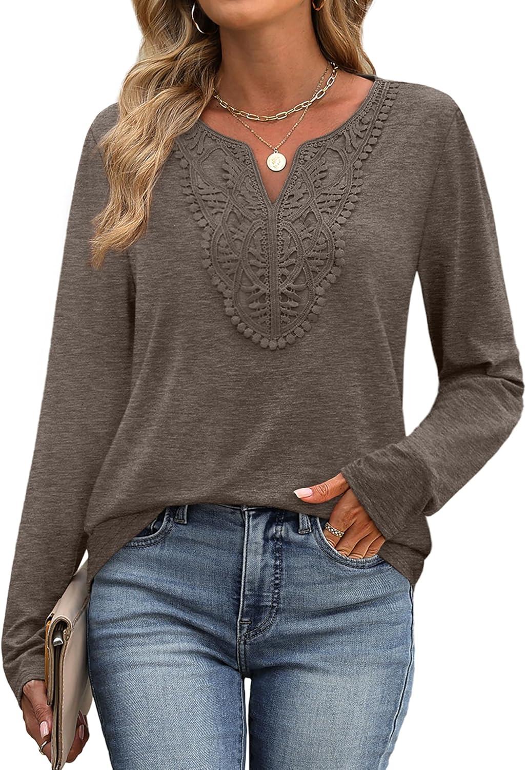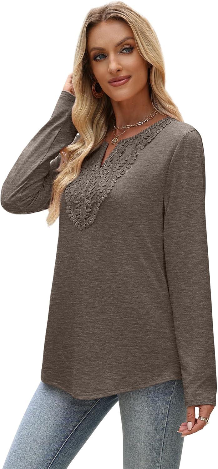 XIEERDUO Boho Tops for Women Blouses Dressy Casual V Neck Long Sleeve Shirts Fall Outfits Trendy Vacation Clothes(Brown)