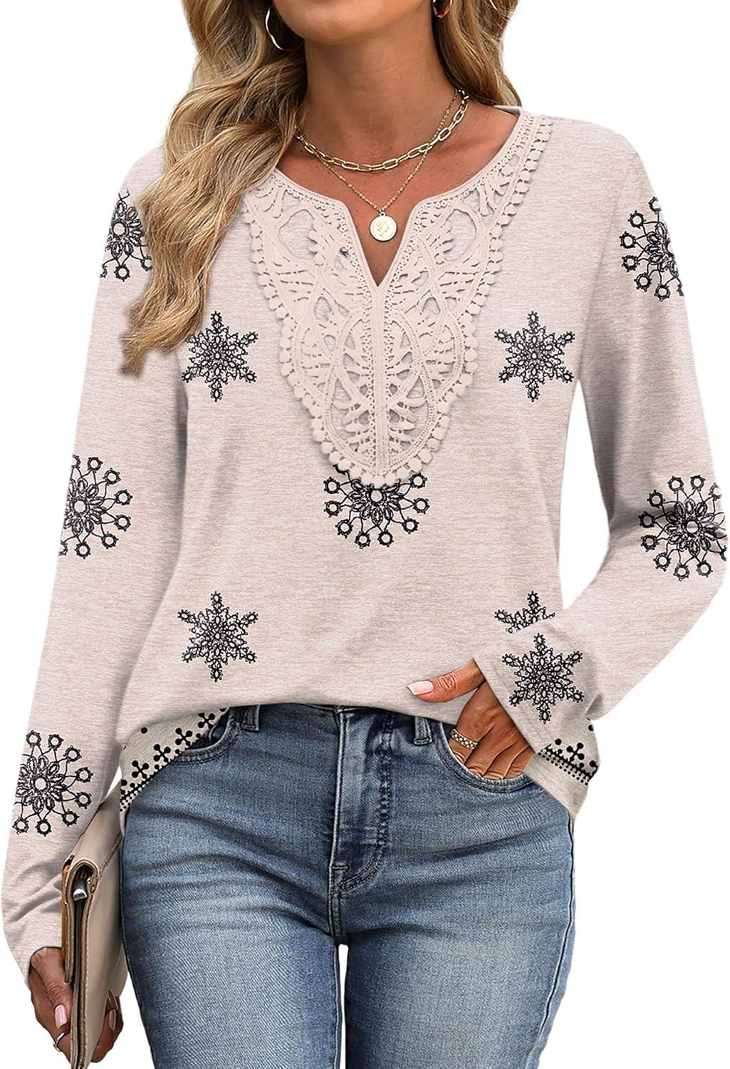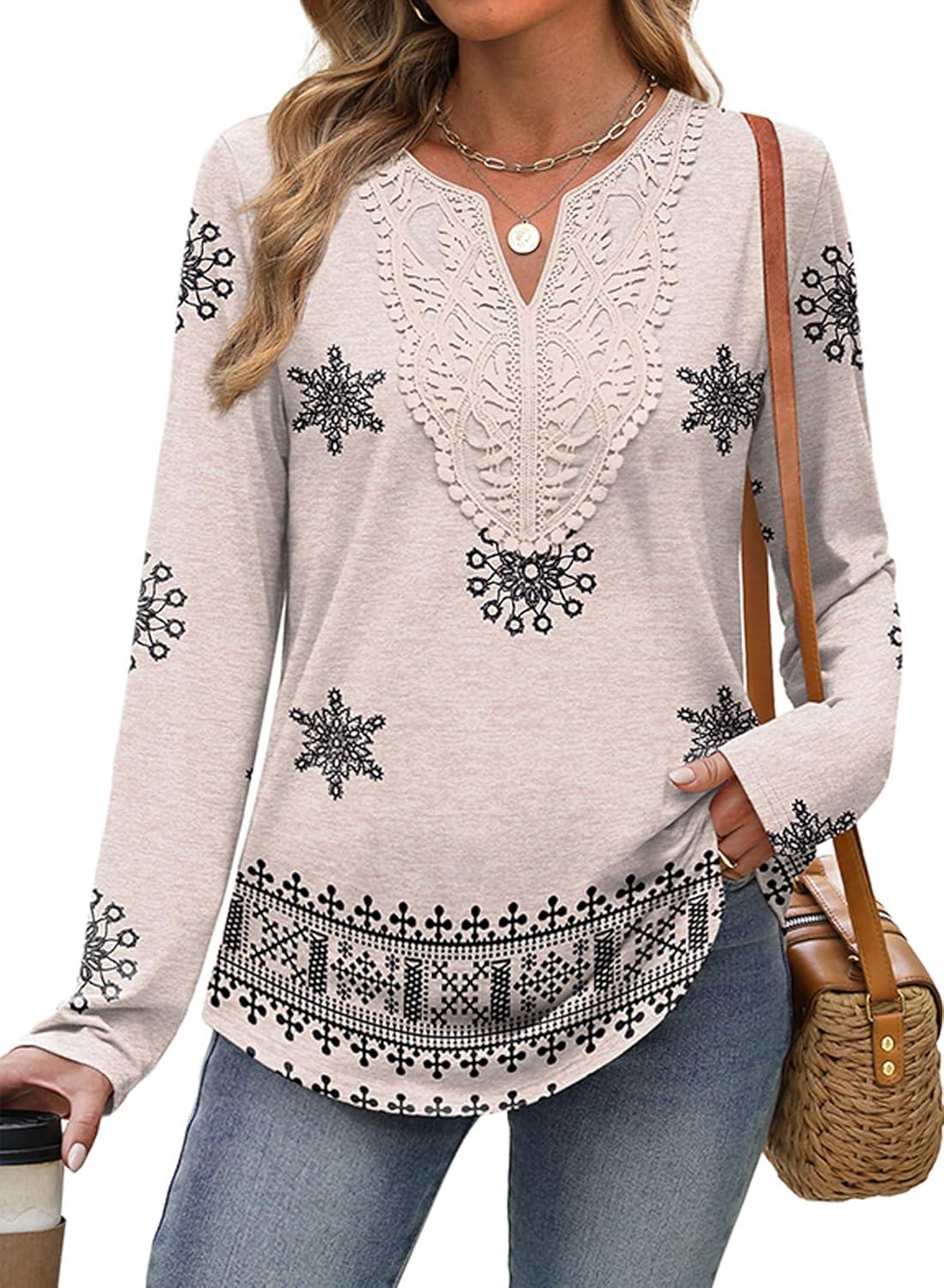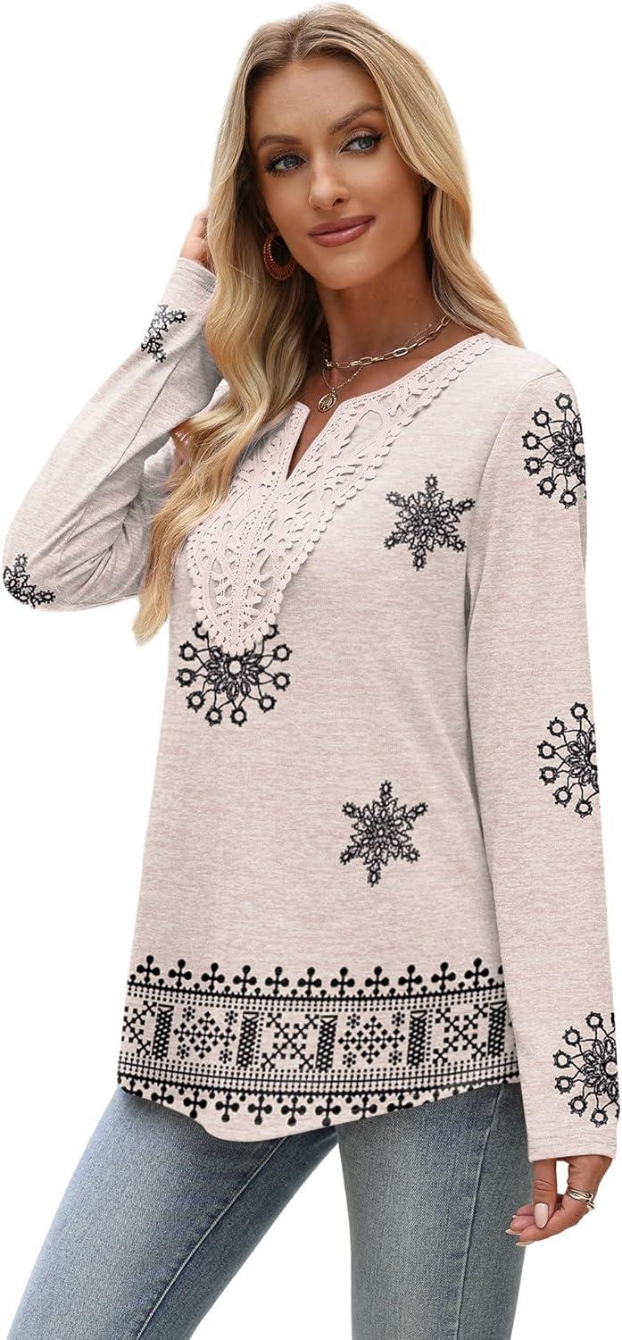 XIEERDUO Boho Tops for Women Blouses Dressy Casual V Neck Long Sleeve Shirts Fall Outfits Trendy Vacation Clothes(Z Begie Printed)