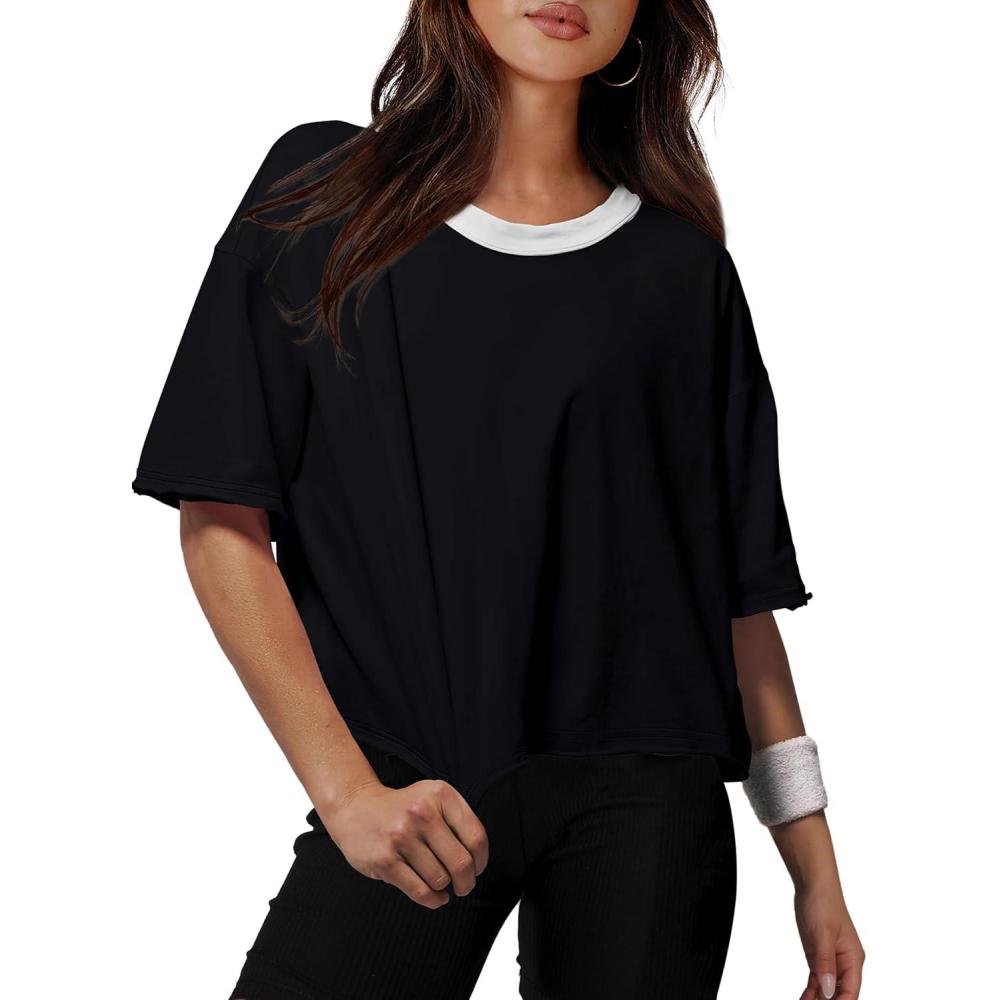XIEERDUO Cotton Tshirts for Women Drop Shoulder Round Neck Oversized Crop Tops Workout Tops Tees(P White Black Contrast)