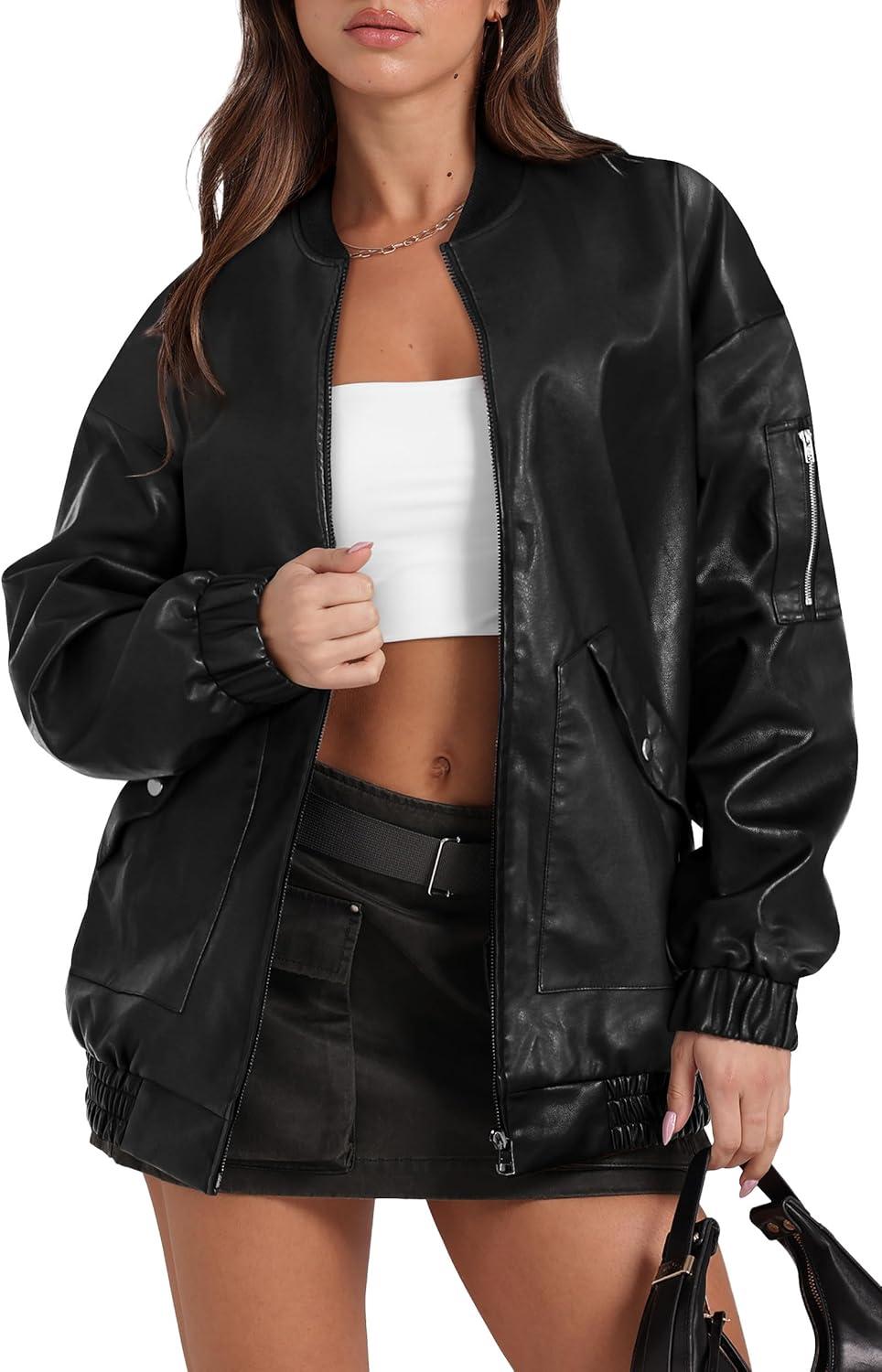 XIEERDUO Faux Leather Jacket Women Oversized Motorcycle Bomber Coats Zip Up Sleeve Pocket 2025 Fall Winter Clothes(Black)