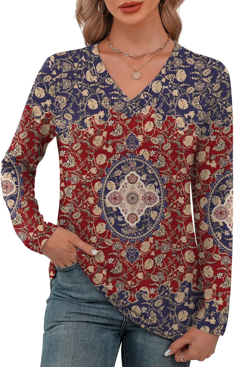 XIEERDUO Long Sleeve Shirts for Women V Neck Fall Tops Basic Tunic Tops Loose Fit Dressy 2025(Boho Print)