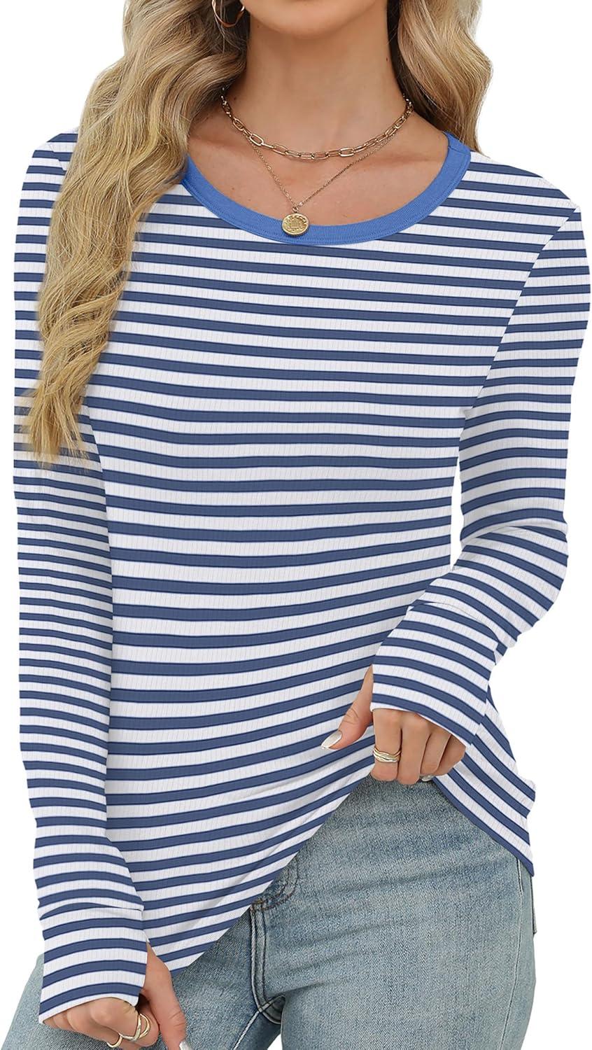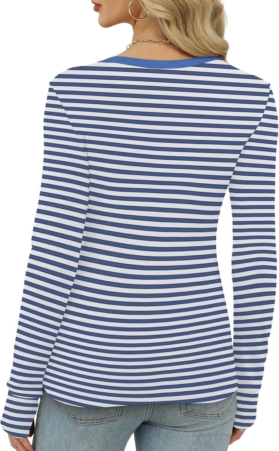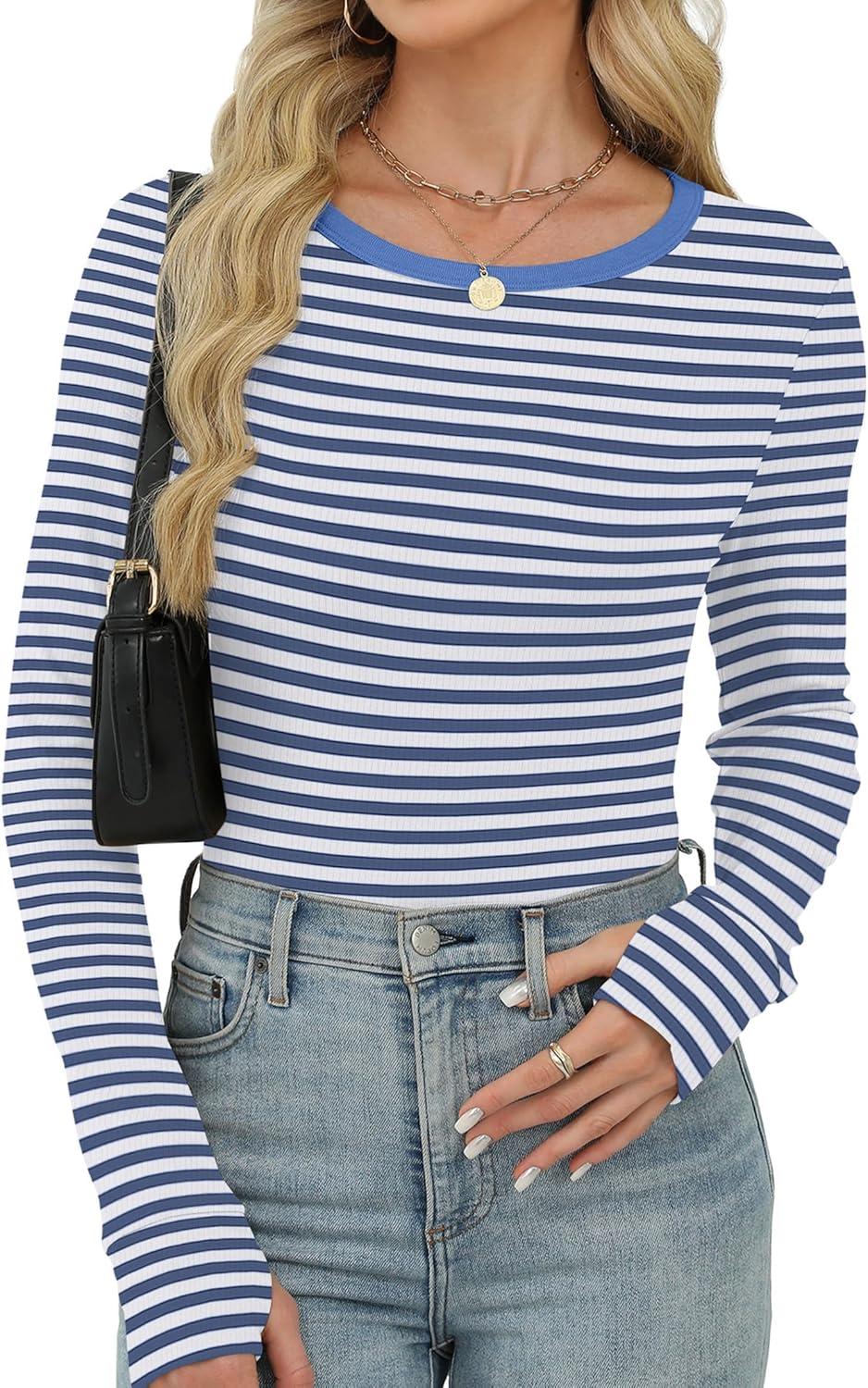 XIEERDUO Long Sleeve Thermal Shirt for Women Fleece Slim Fit Tops Crewneck Basic T-Shirts with Thumb Holes Fall Fashion 2025(Stripe-blue & White)