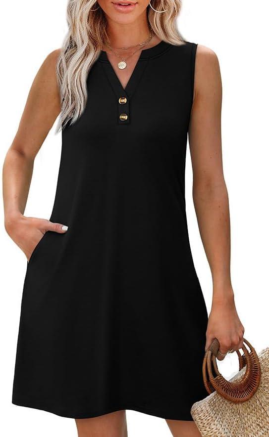XIEERDUO Summer Dresses for Women 2026 Beach Vacation Clothes V Neck Button Sundresses with Pockets(Black)