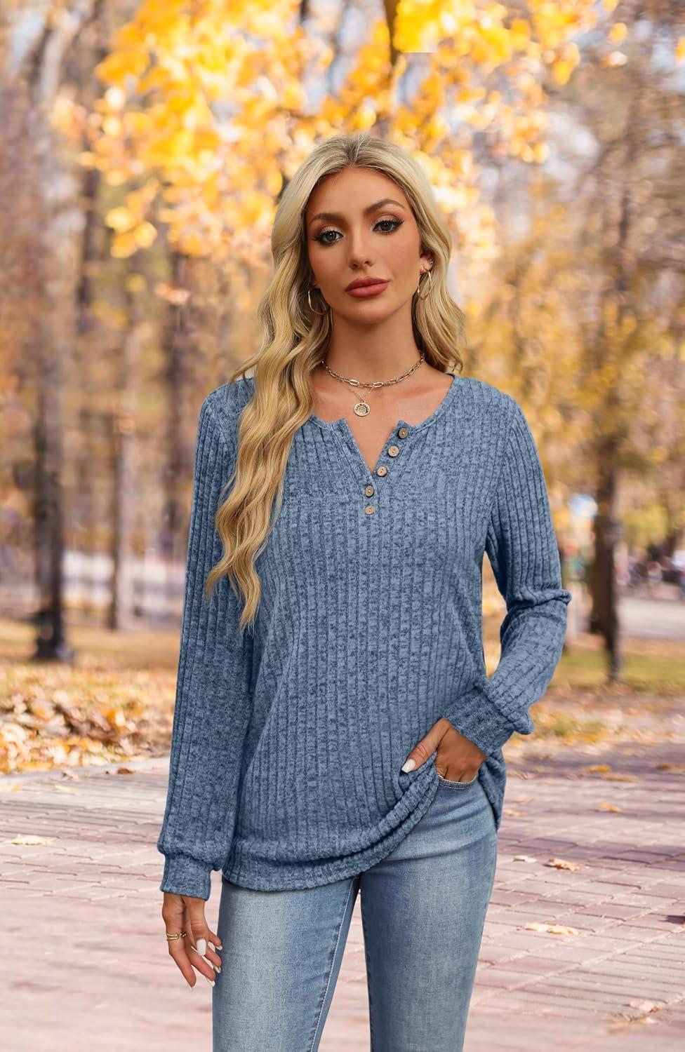 XIEERDUO Sweater for Women Long Sleeve Henley Shirts Fall Tunic Tops to Wear with Leggings Crew Neck Outfits Trendy 2025(Blue)