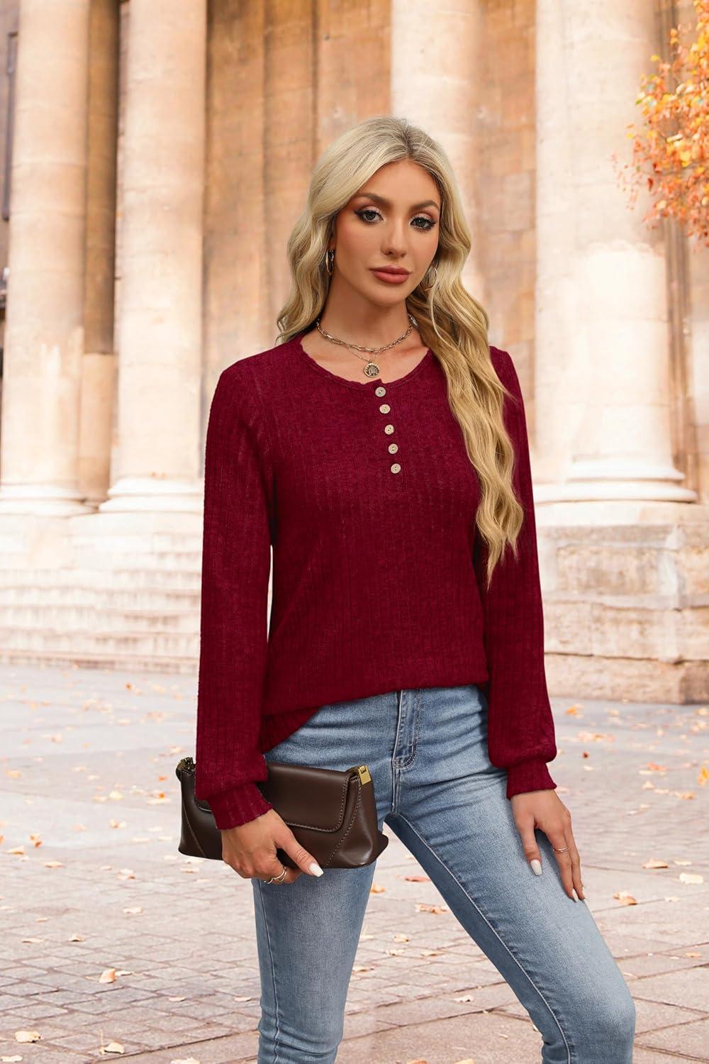 XIEERDUO Sweater for Women Long Sleeve Henley Shirts Fall Tunic Tops to Wear with Leggings Crew Neck Outfits Trendy 2025(Burgundy)