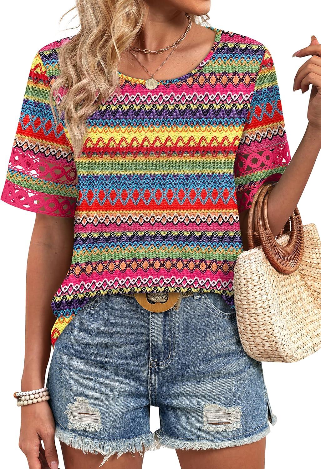 XIEERDUO Women Blouses Dressy Casual Summer Tops Color Block Short Sleeve Shirts Fashion Business Casual Outfits(Z Colorful Stripe)