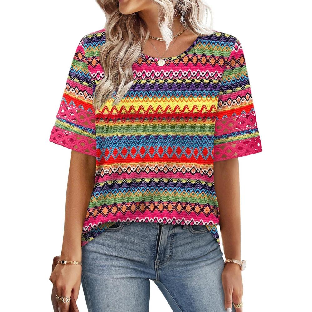 image:imageXIEERDUO Women Blouses Dressy Casual Summer Tops Color Block Short Sleeve Shirts Fashion Business Casual OutfitsZ Colorful Stripe
