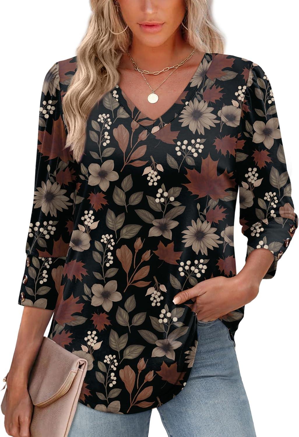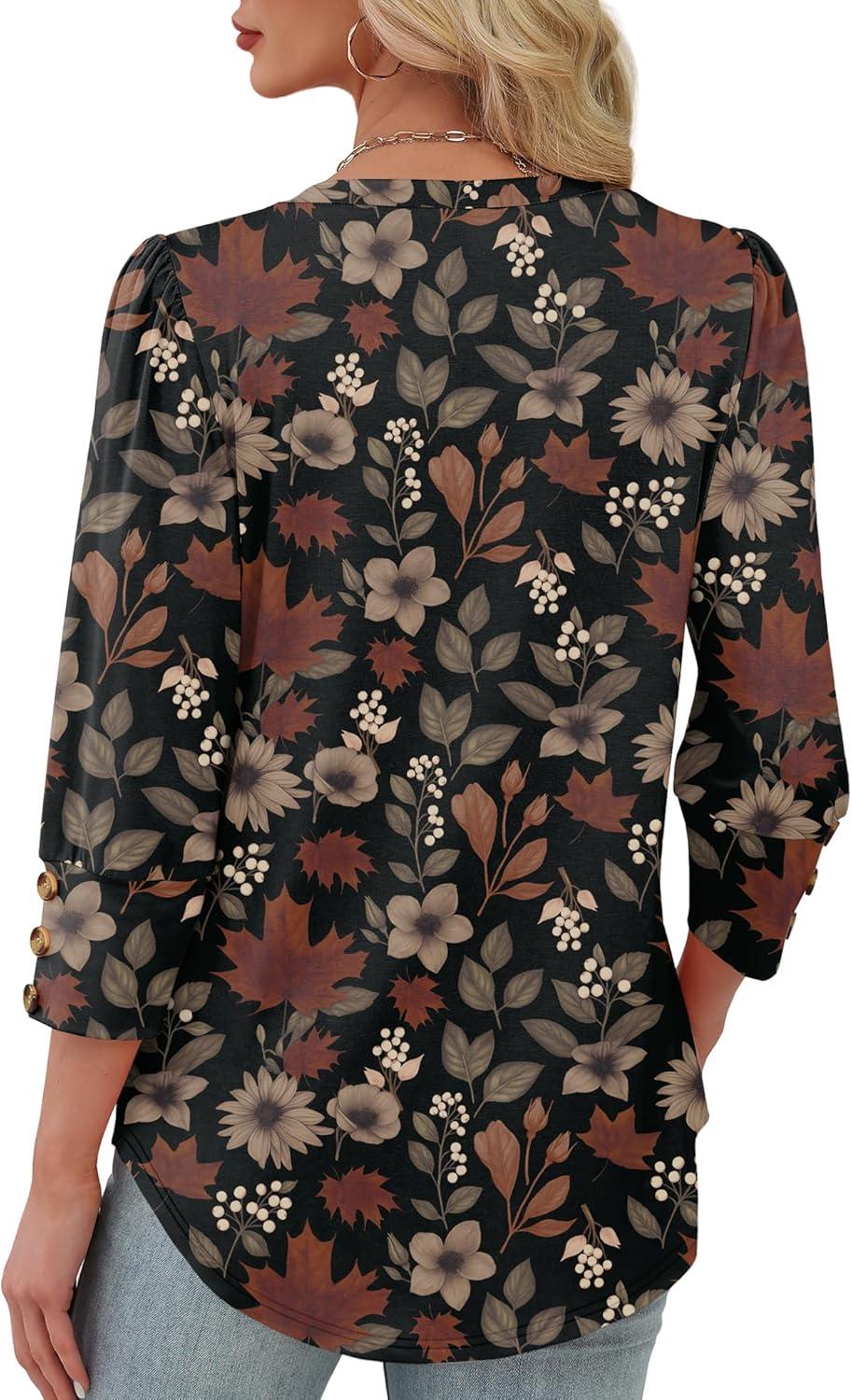 XIEERDUO Womens 3/4 Sleeve Tops with Buttons V-Neck Summer Outfits Casual Blouses Shirts Beach Vacation Fall Clothes 2025(F-dark Floral Leaf)
