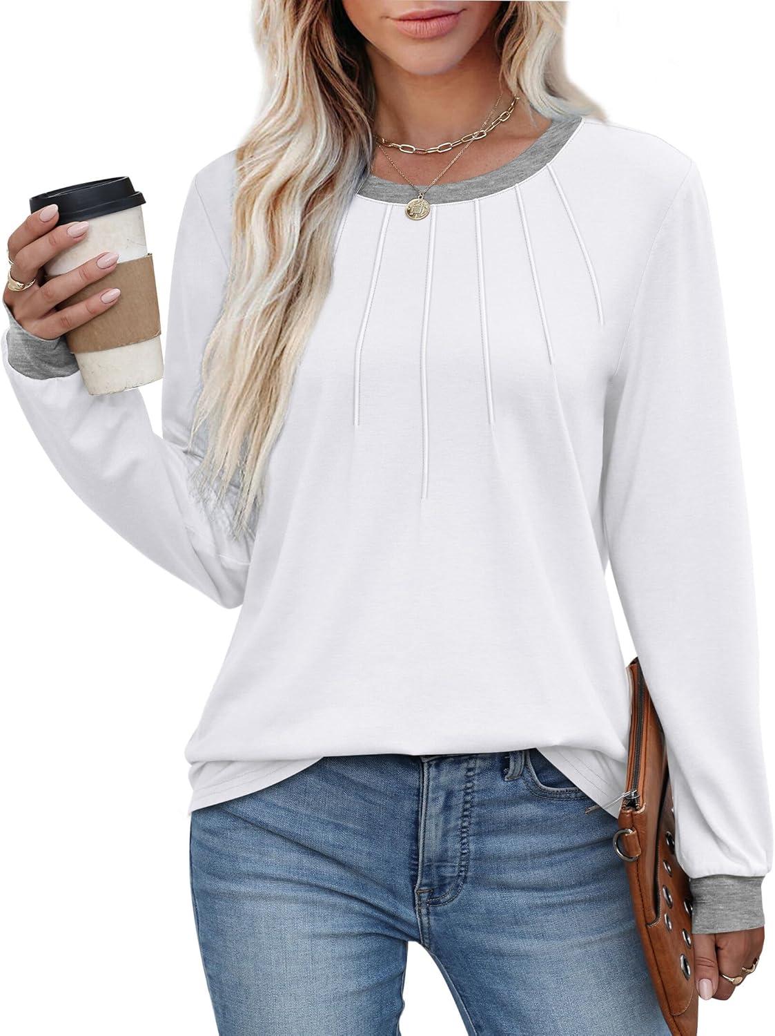 XIEERDUO Womens Long Sleeve Tops Color Block Casual Crewneck Tops Tshirt Basic Tee Fall Fashion Clothes Trendy Outfits(White)