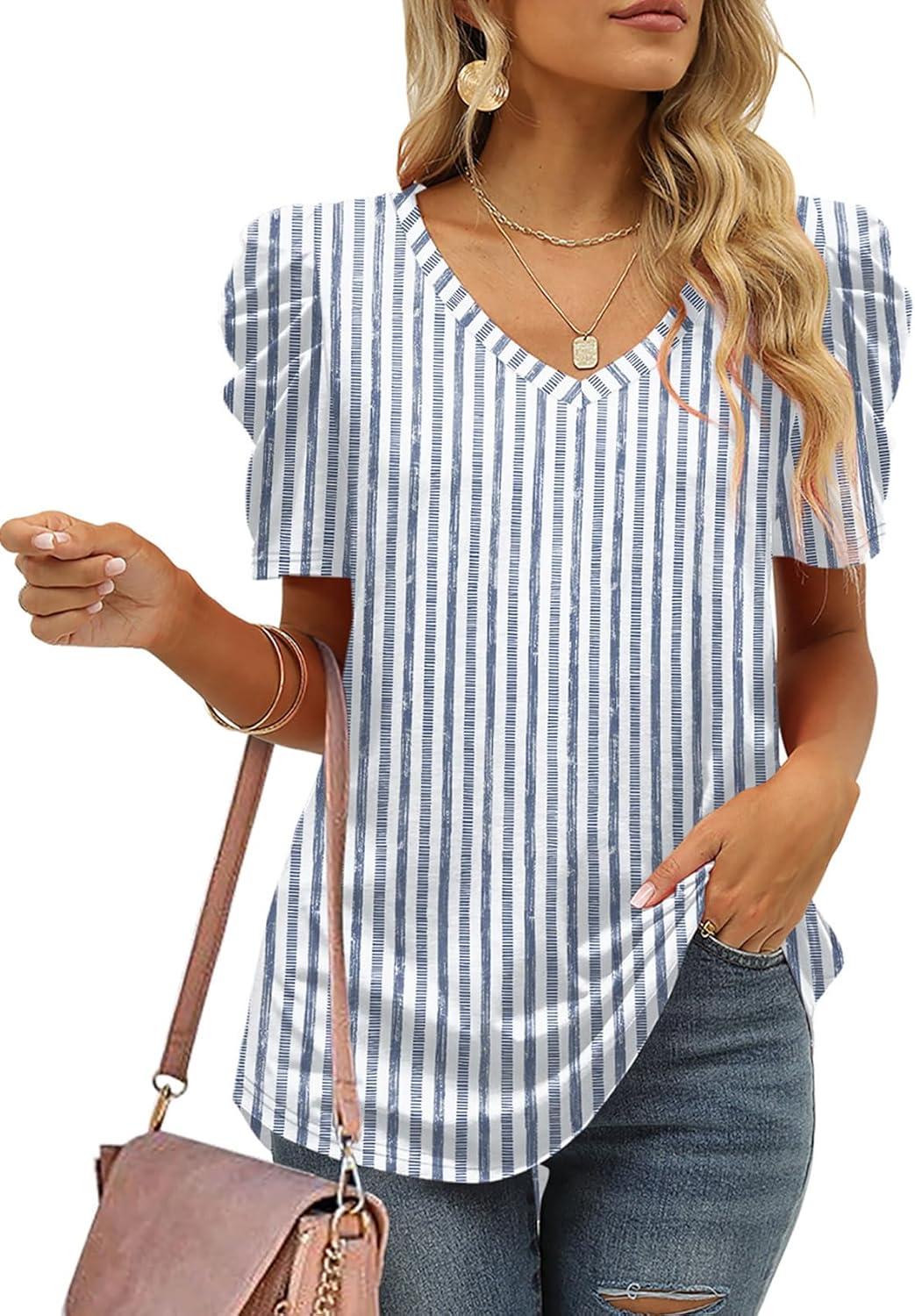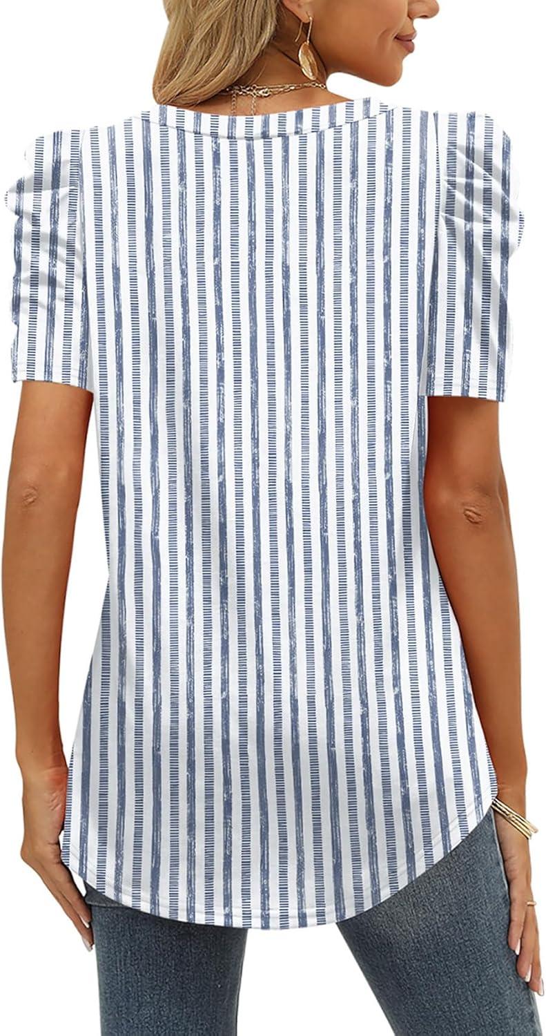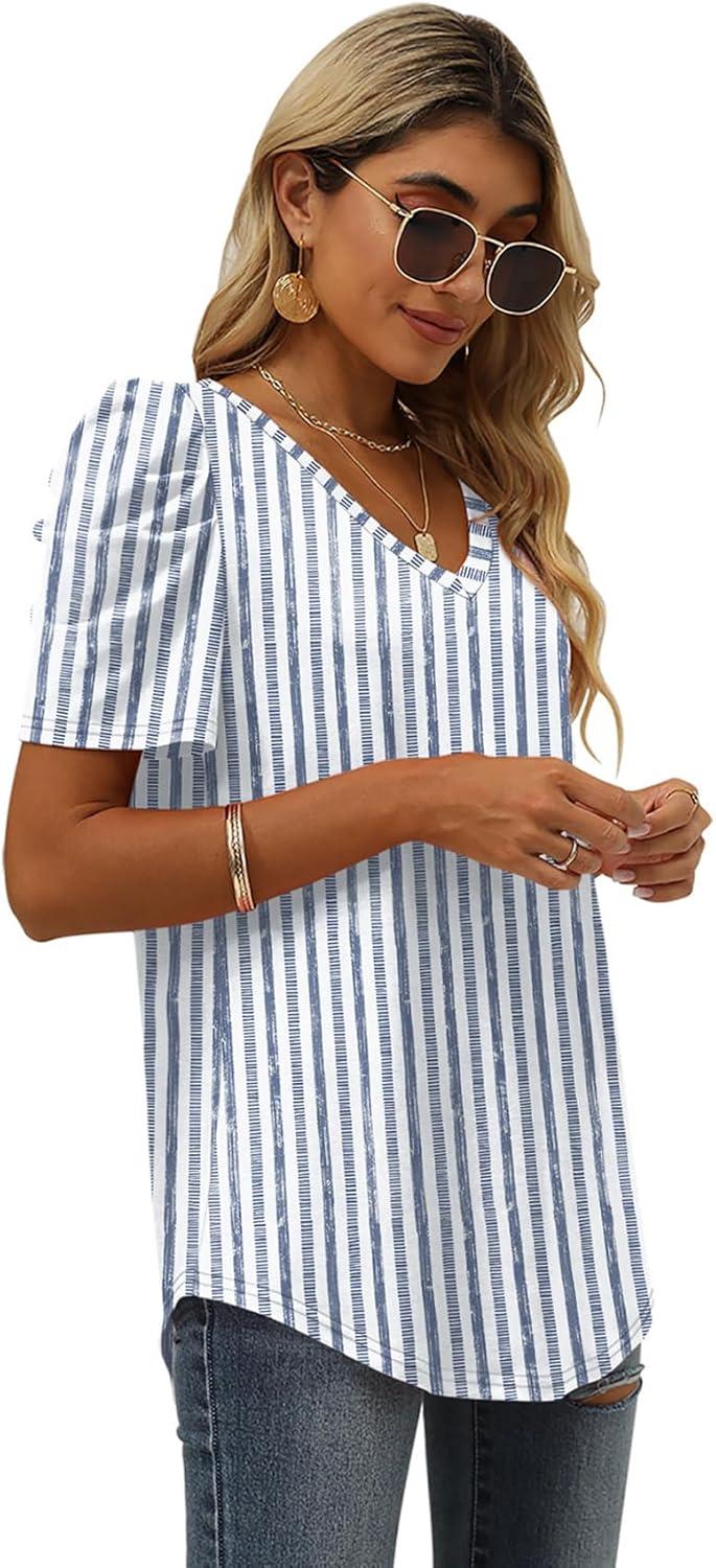 XIEERDUO Womens Summer Shirt V Neck Casual Tshirts Puff Sleeve Tops for Women Solid Color XS-3XL(21-blue Stripe)