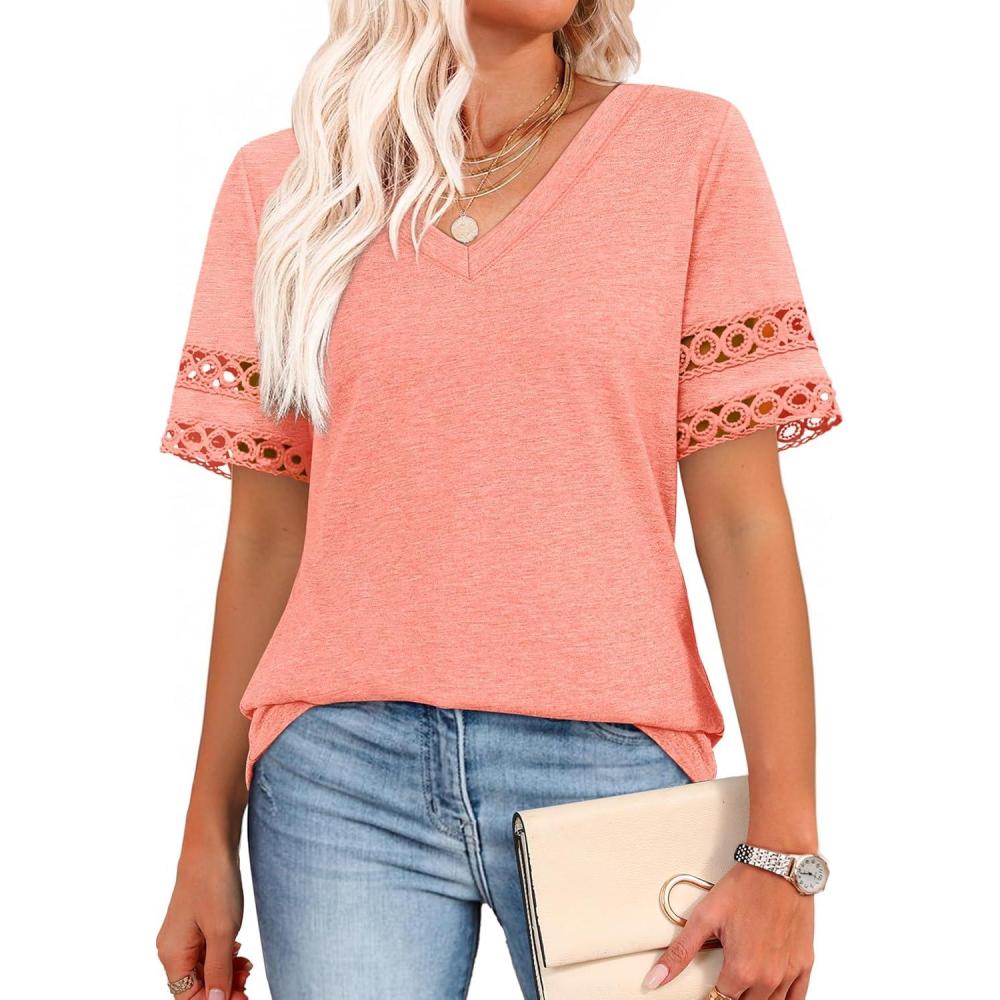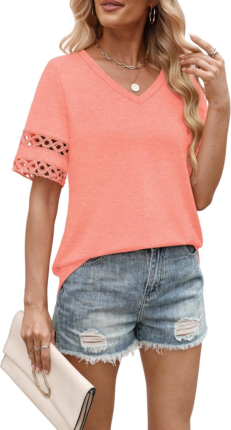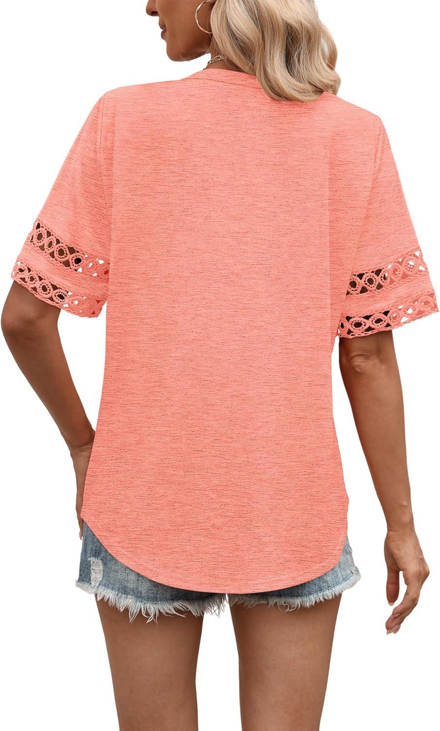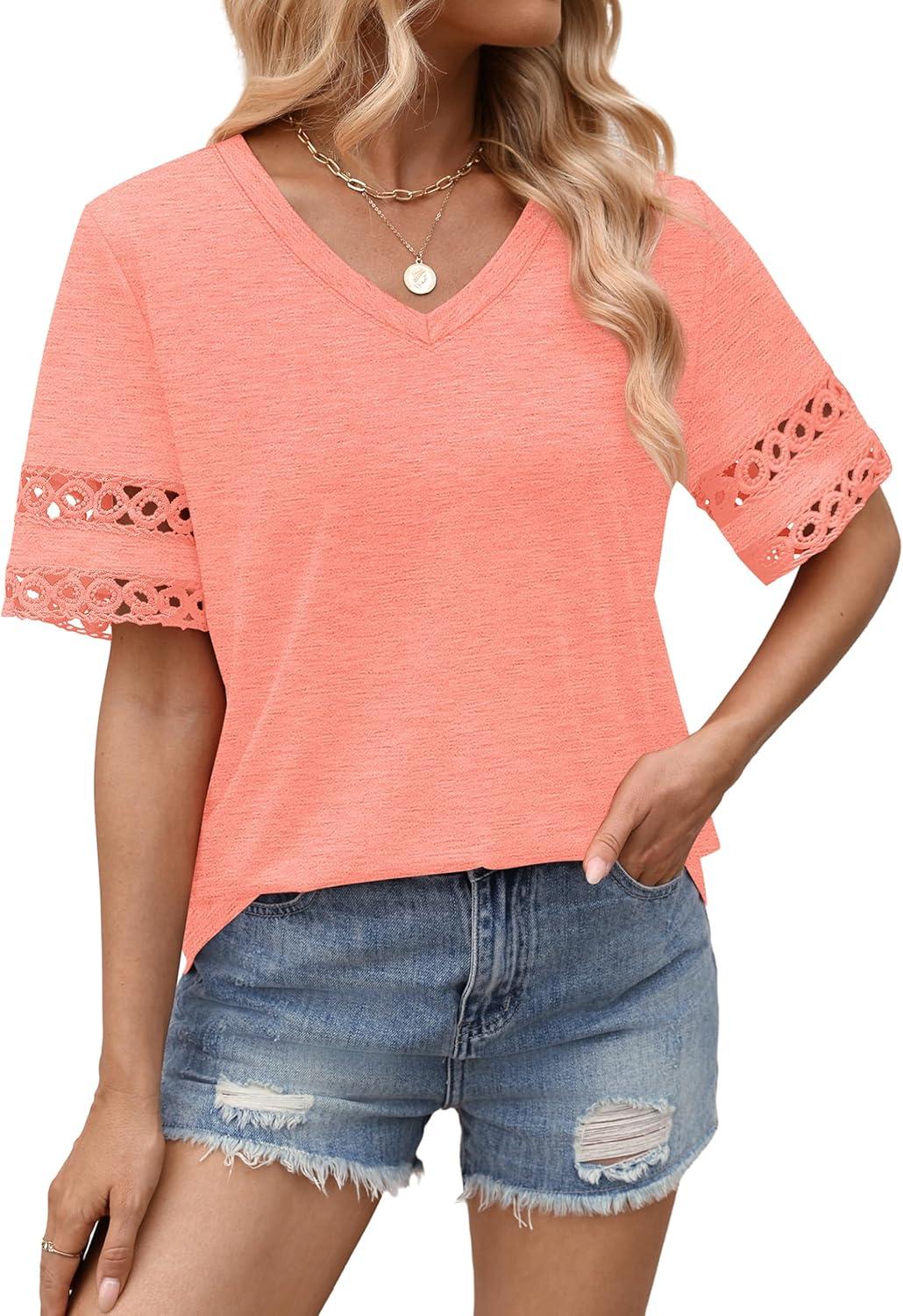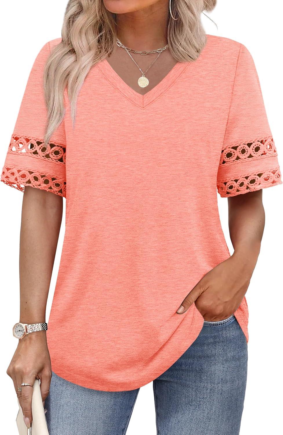 XIEERDUO Womens Summer Tops Dressy Casual Blouses for Women V Neck Short Sleeve Shirts Fashion Clothes Curved Hem Flowy(Coral)