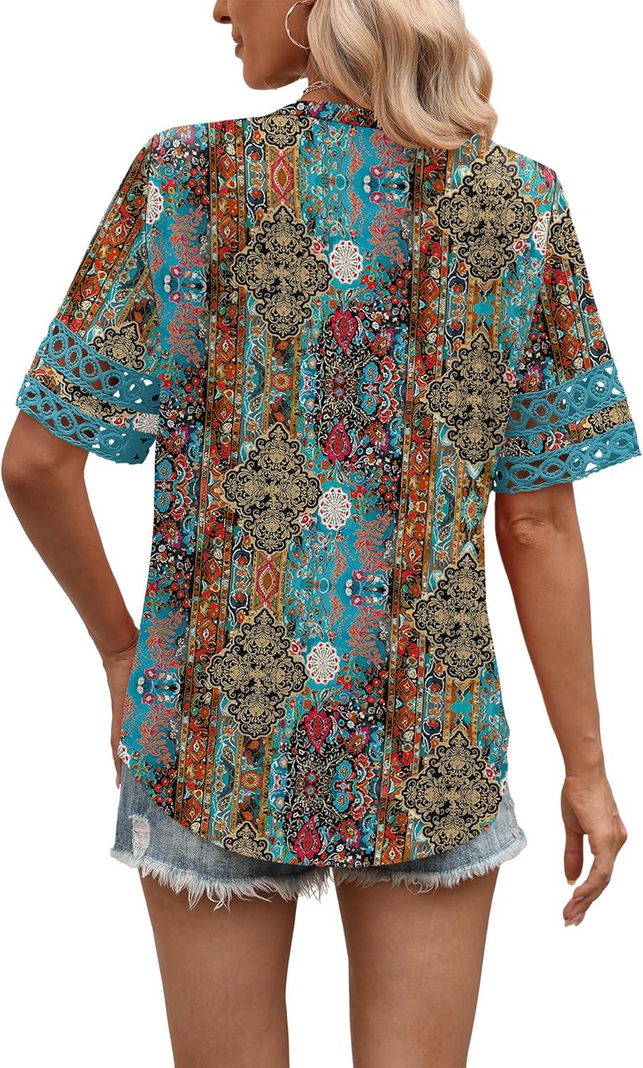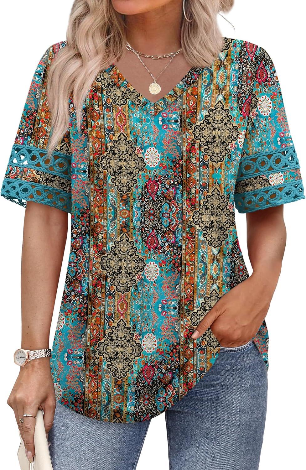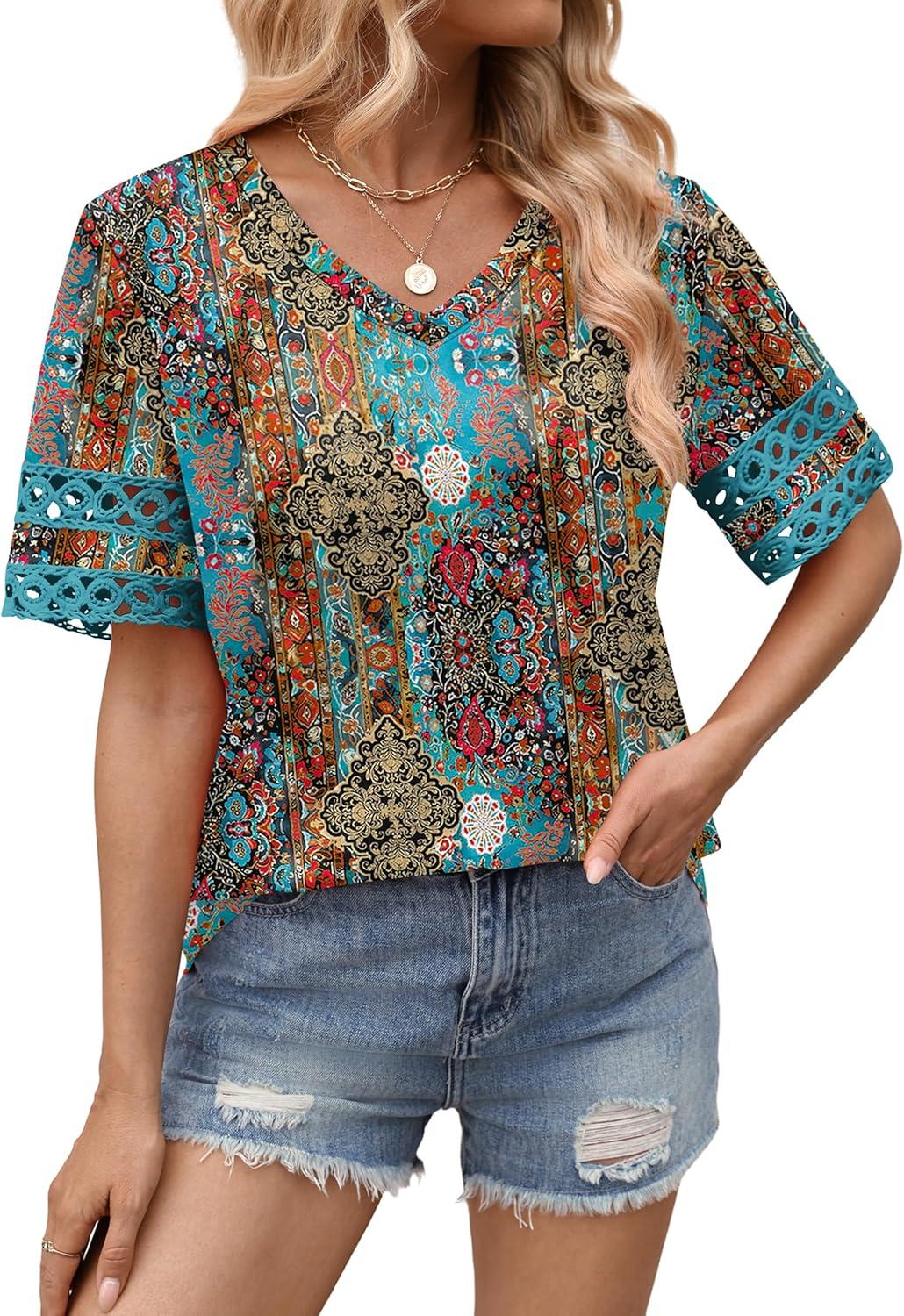 XIEERDUO Womens Summer Tops Dressy Casual Blouses for Women V Neck Short Sleeve Shirts Fashion Clothes Curved Hem Flowy(Turquoise)