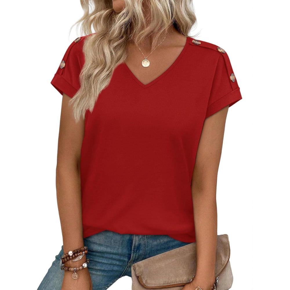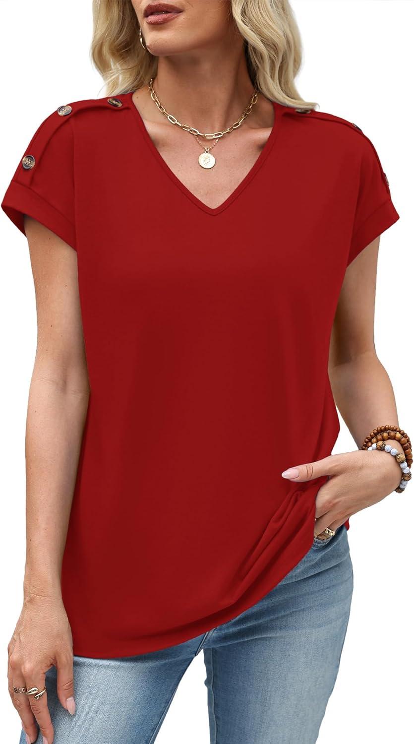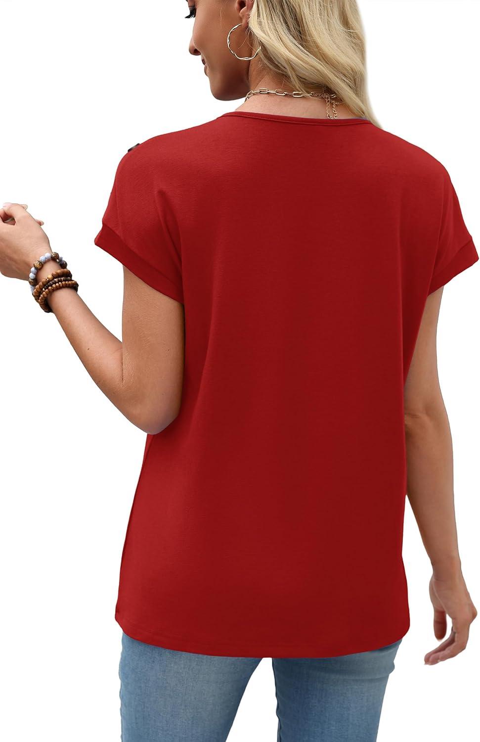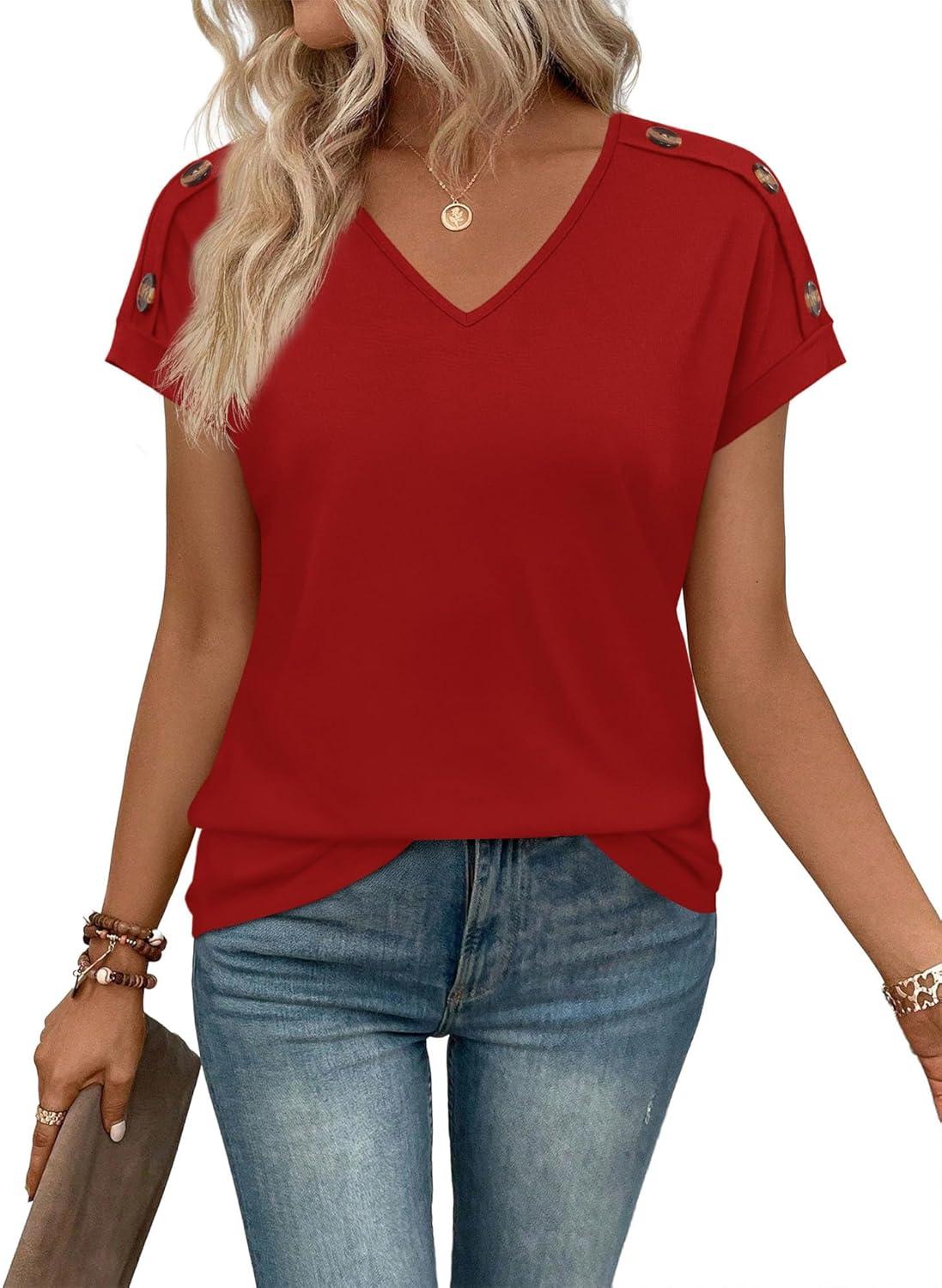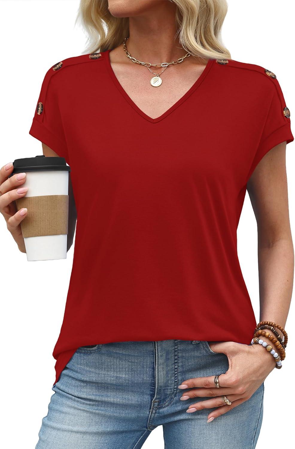XIEERDUO Womens Summer Tops Short Sleeve Shirts with Buttons V Neck Trendy Tunic Blouses Beach Vacation Clothes(A-red)