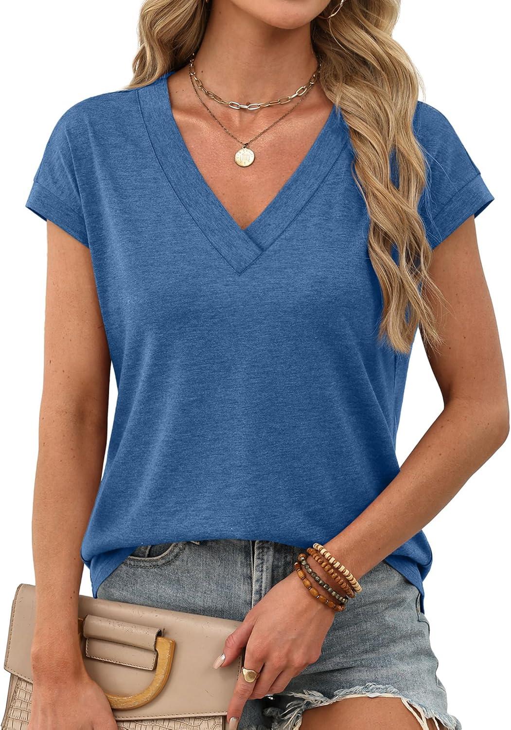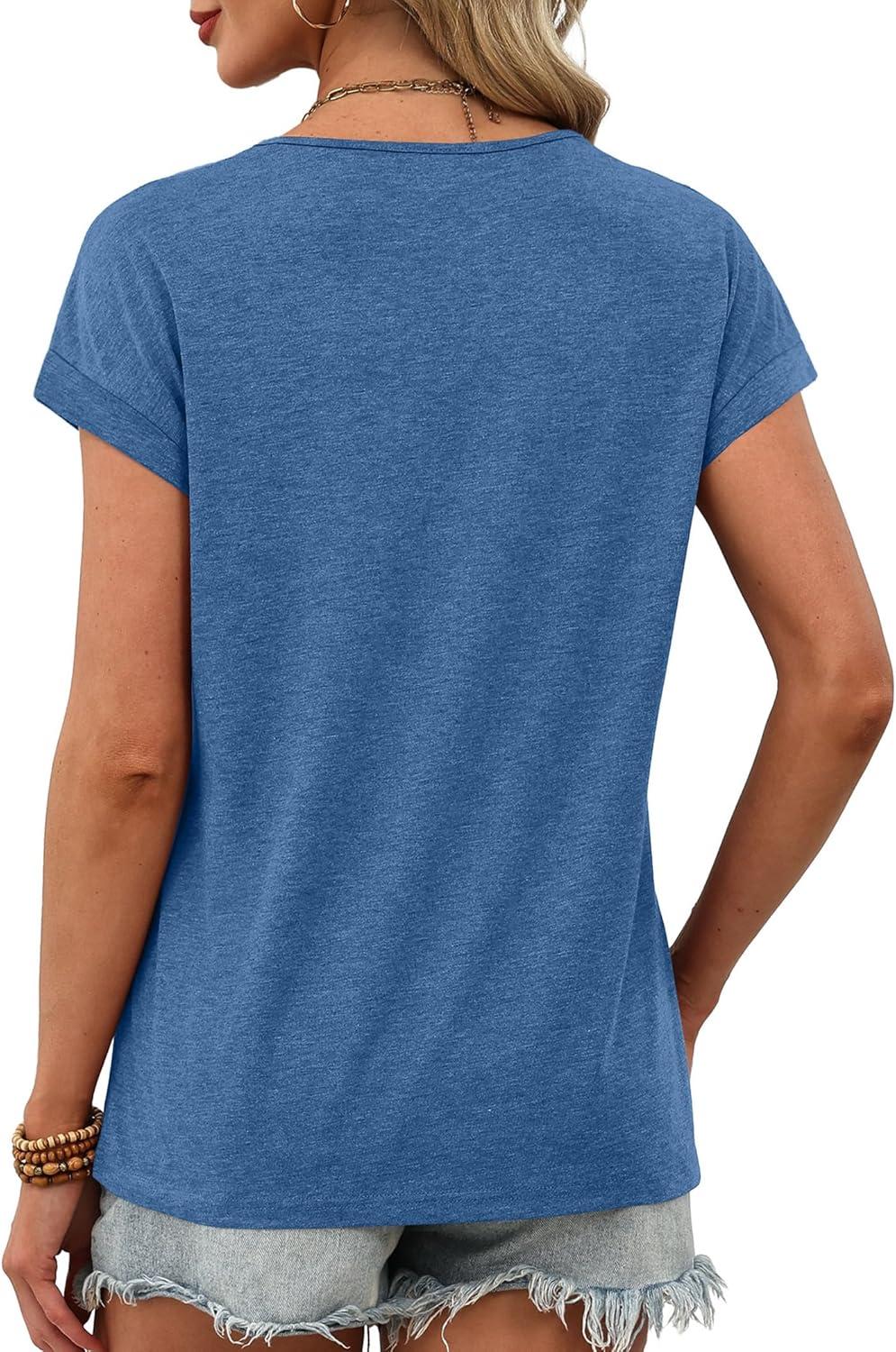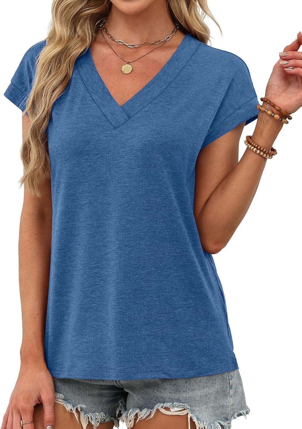 XIEERDUO Womens Summer Tops Short Sleeve Shrits 2026 Trendy V Neck Spring Outfits Beach Vacation Clothes(Dark Blue)