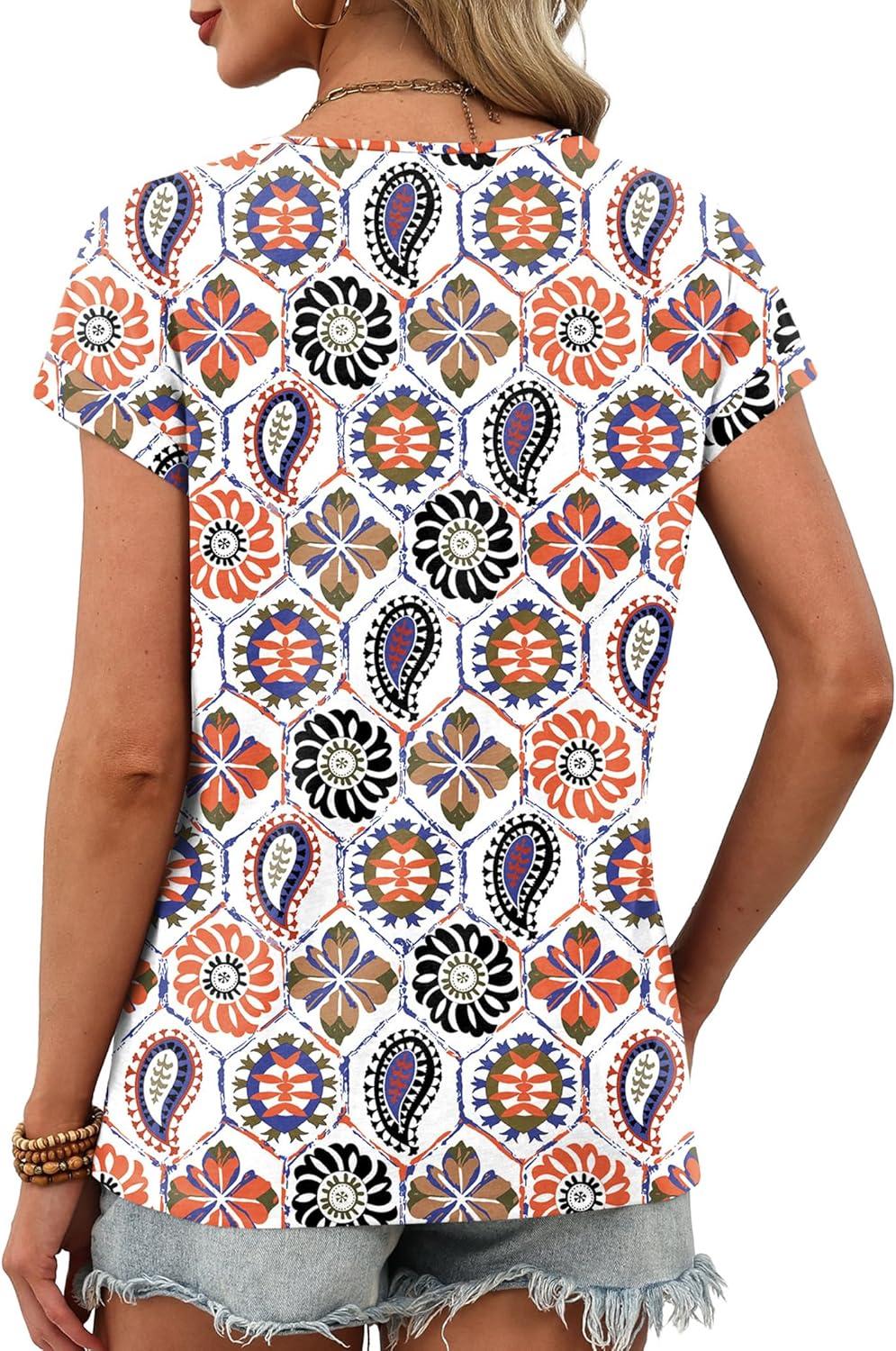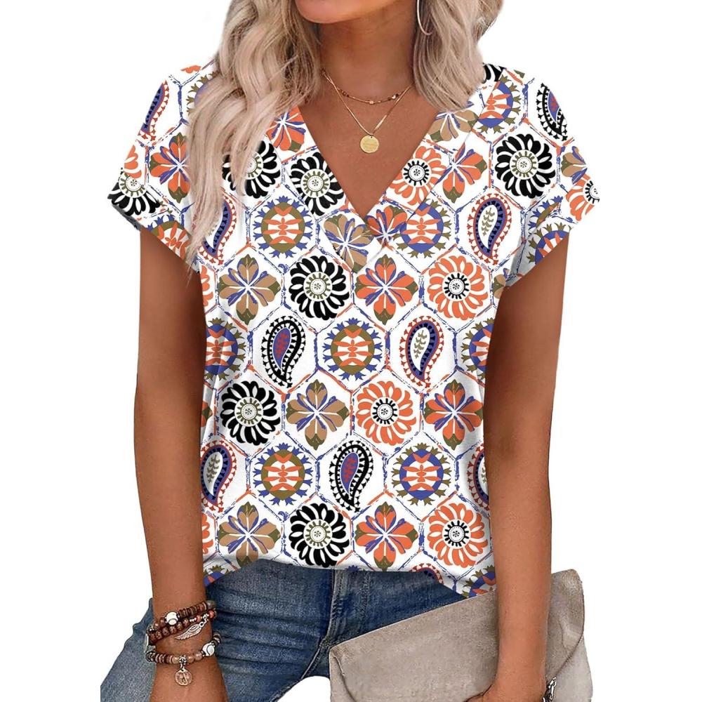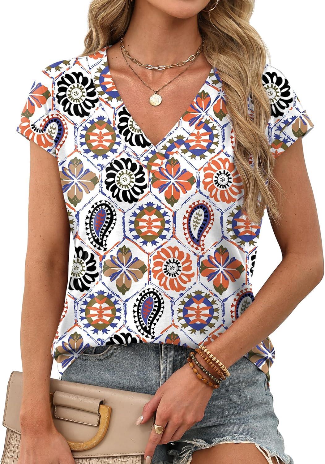 XIEERDUO Womens Summer Tops Short Sleeve Shrits 2026 Trendy V Neck Spring Outfits Beach Vacation Clothes(Patterned-boho Print)