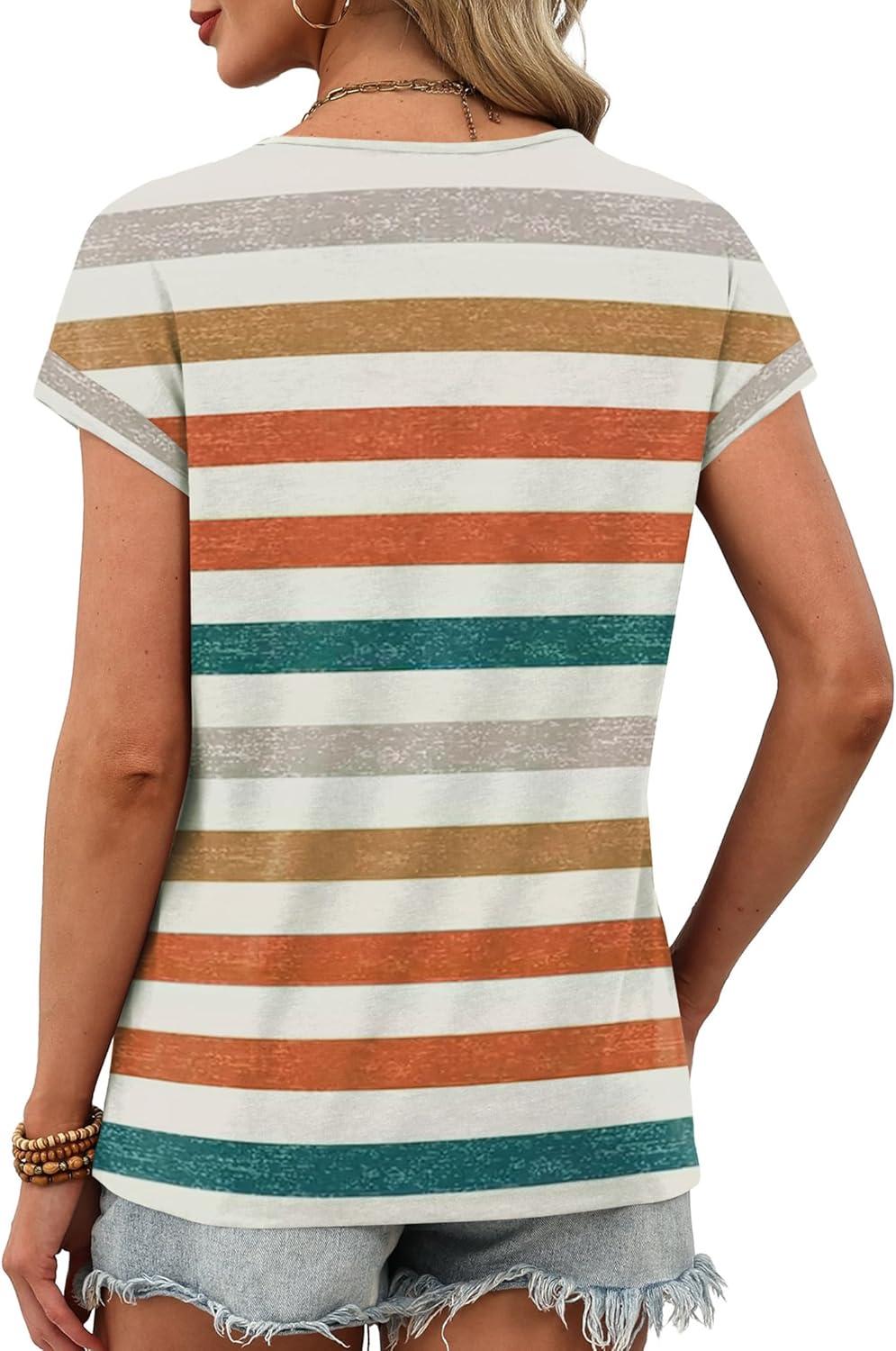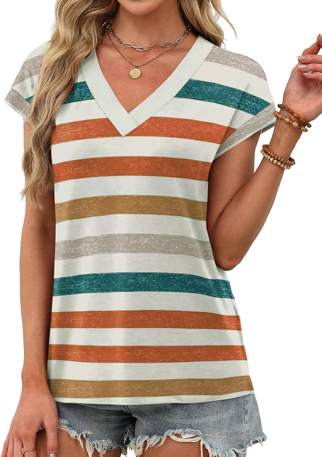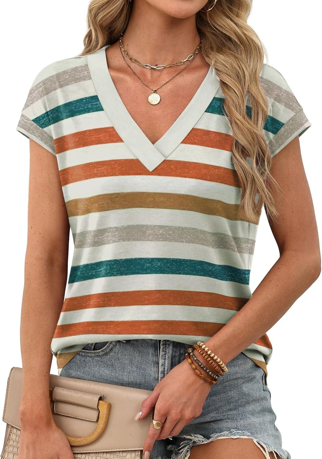XIEERDUO Womens Summer Tops Short Sleeve Shrits 2026 Trendy V Neck Spring Outfits Beach Vacation Clothes(Patterned-multicolor Stripe)
